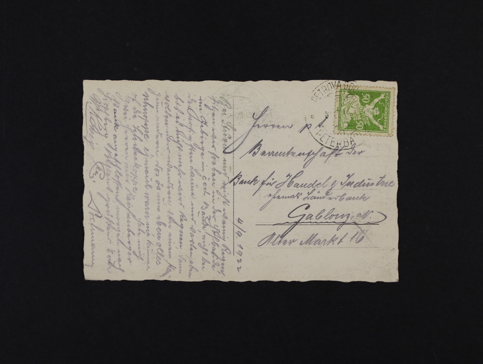 dopis v místě frank. zn. č. 145 A + 155 s DV 1 vajíčko v pase, pod. dvojjazyčným raz. PODMOKLY 22.2.20, zatíž. tr. portem 100h zn. DL č. 9