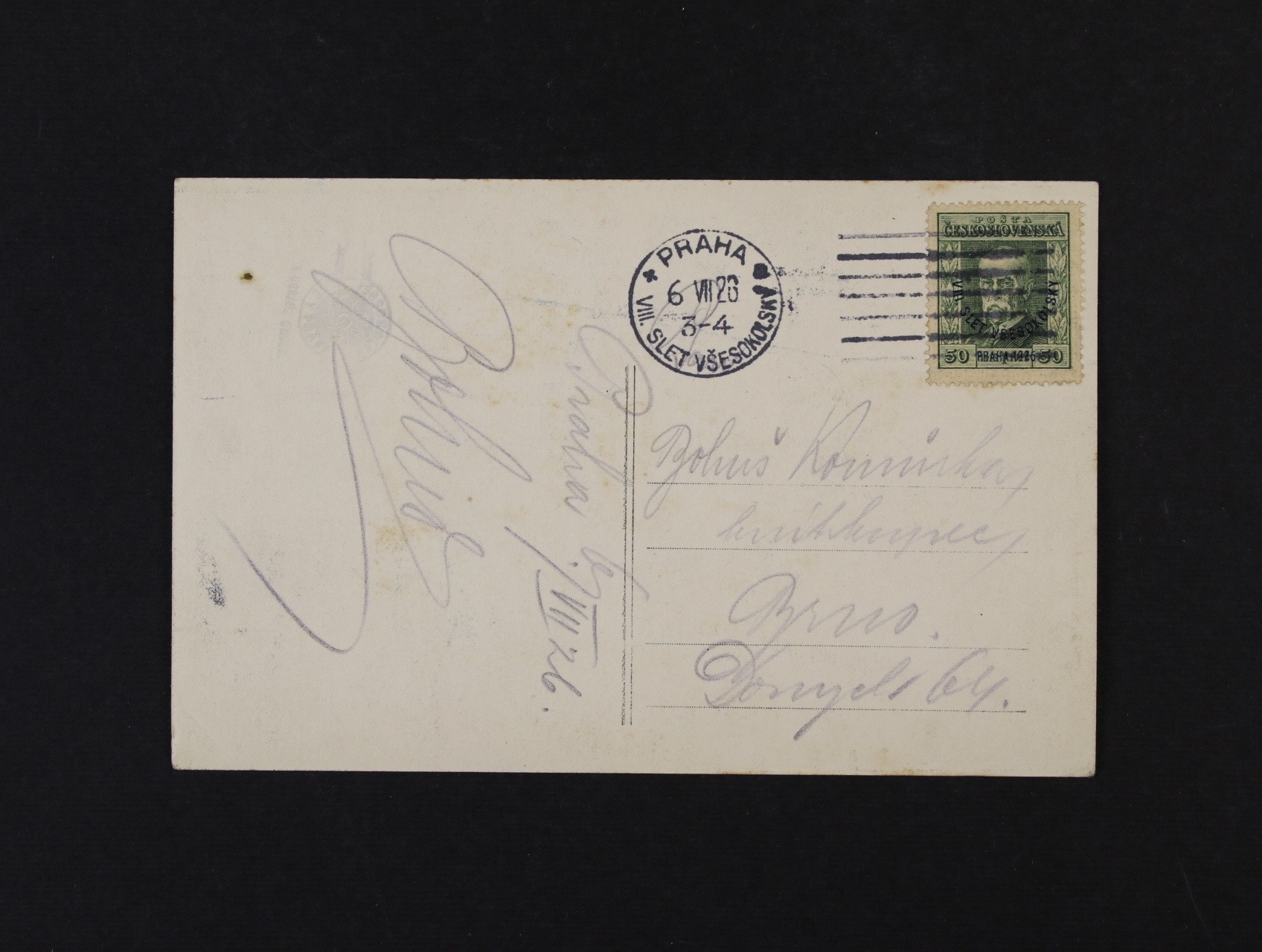 509 sletová pohlednice ze zahájení VIII. všesokolského sletu frank. zn. č. 183, pod. raz. PRAHA VII. SLET VŠESOKOLSKÝ 6.7.1926, zajímavé 300