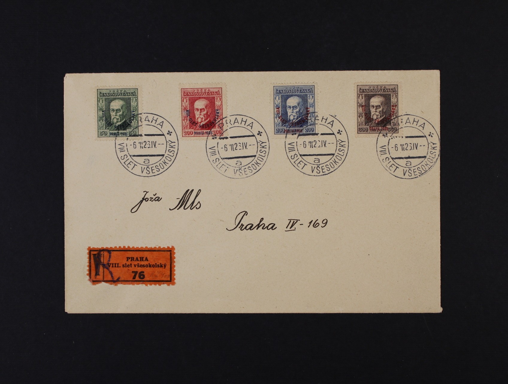 510 R-dopis v místě frank. kompl. sérií zn. č. 183 - 186 se sletovou nálepkou a raz. PRAHA VIII. SLET VŠESOKOLSKÝ 6.7.1926 na zadní str. dvě různé slet. nálepky a sletové raz. 600