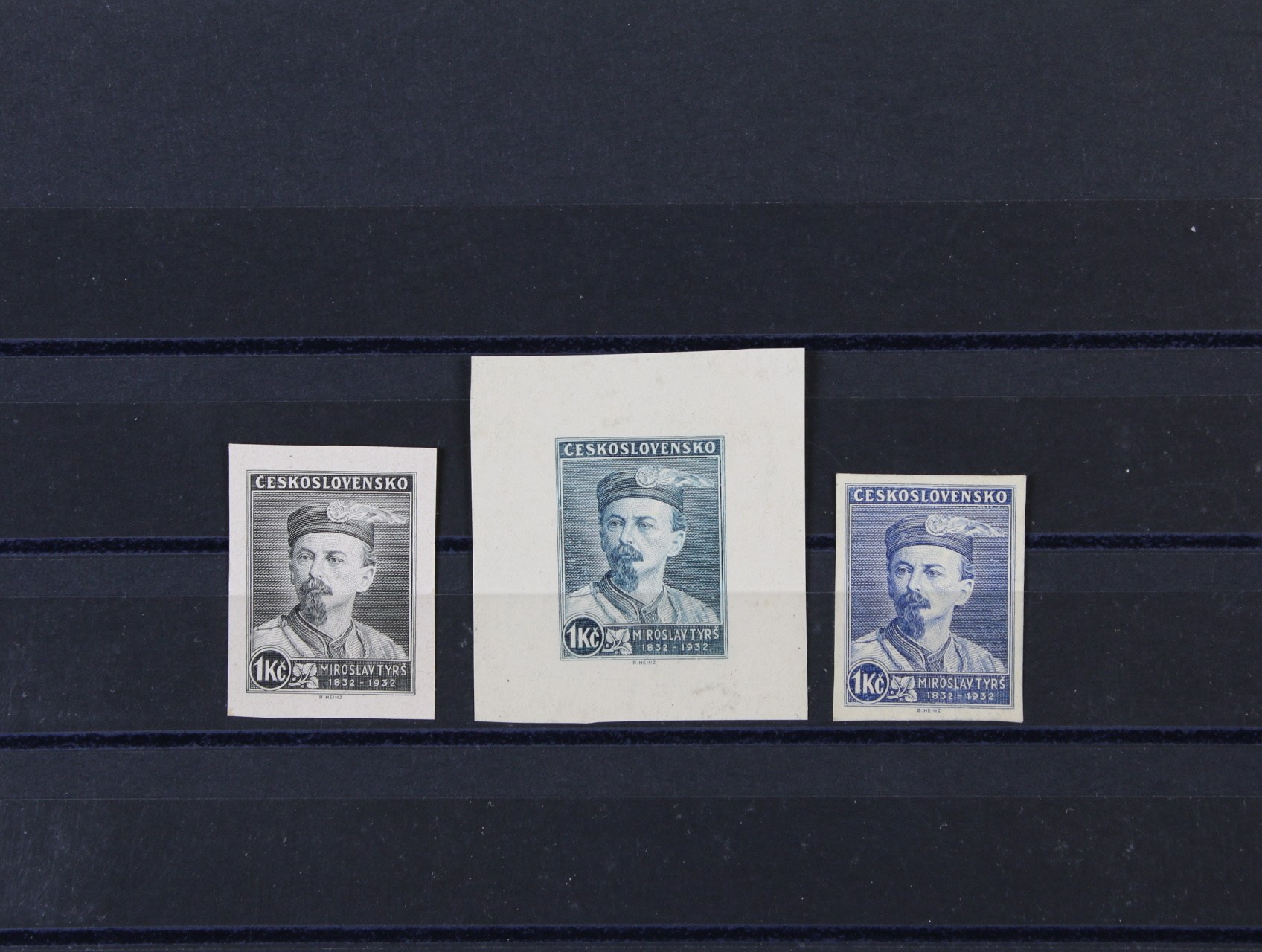 539 otisk rytiny zn. č. 227 od B. Heinze se změněnou kresbou a hodnotou 1Kč v černé a modré barvě ve formátu stříhaných zn. a v barvě zelenomodré na větším kousku papíru 2600
