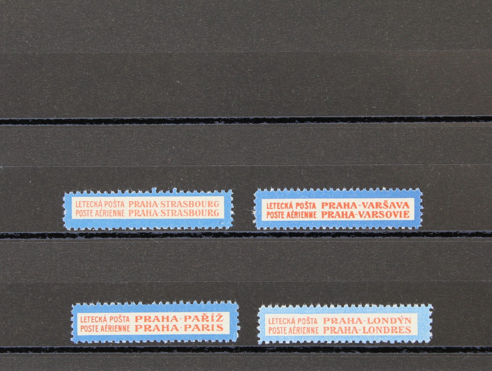 seastava 4 ks let. dvojjazyčných směrovek PRAHA - STRASBOURG, PRAHA - PAŘÍŽ, PRAHA - VARŠAVA, PRAHA - LONDÝN