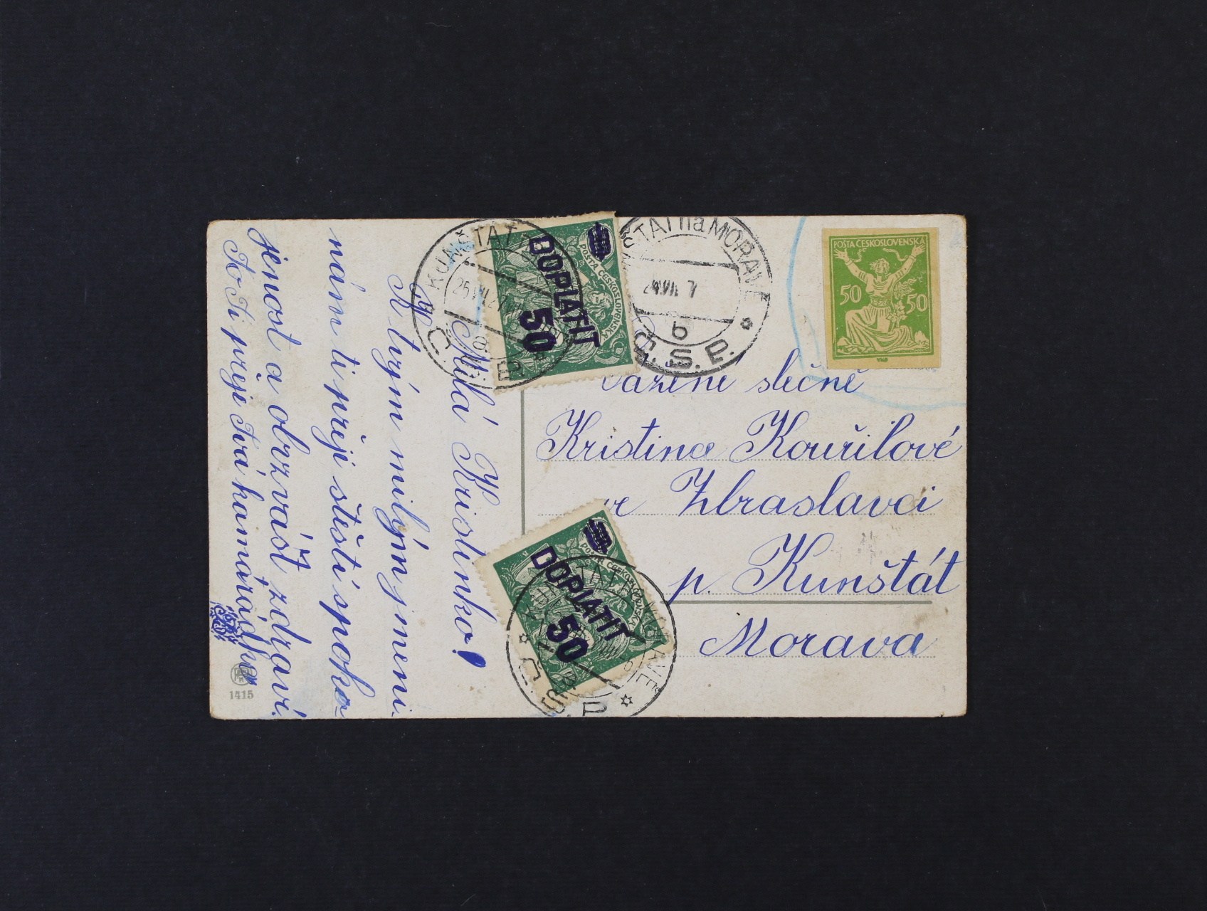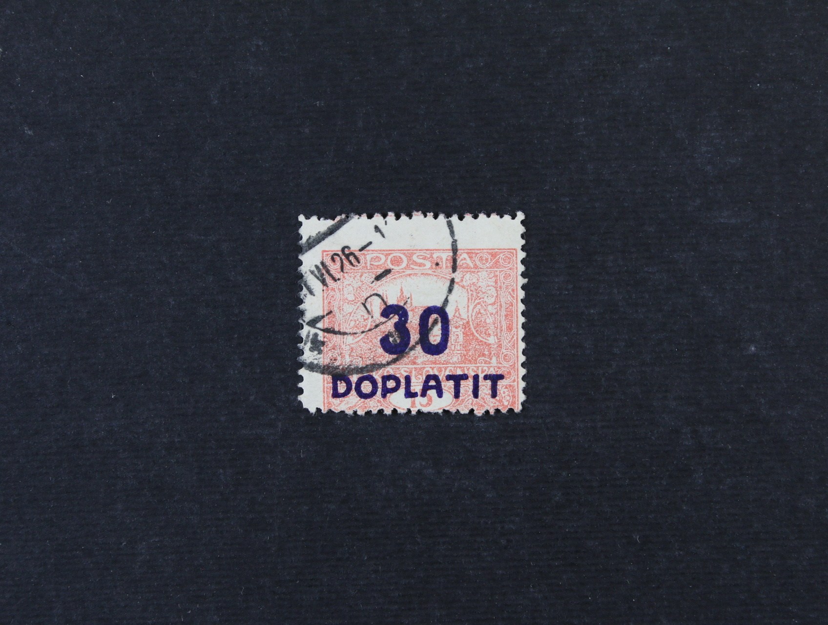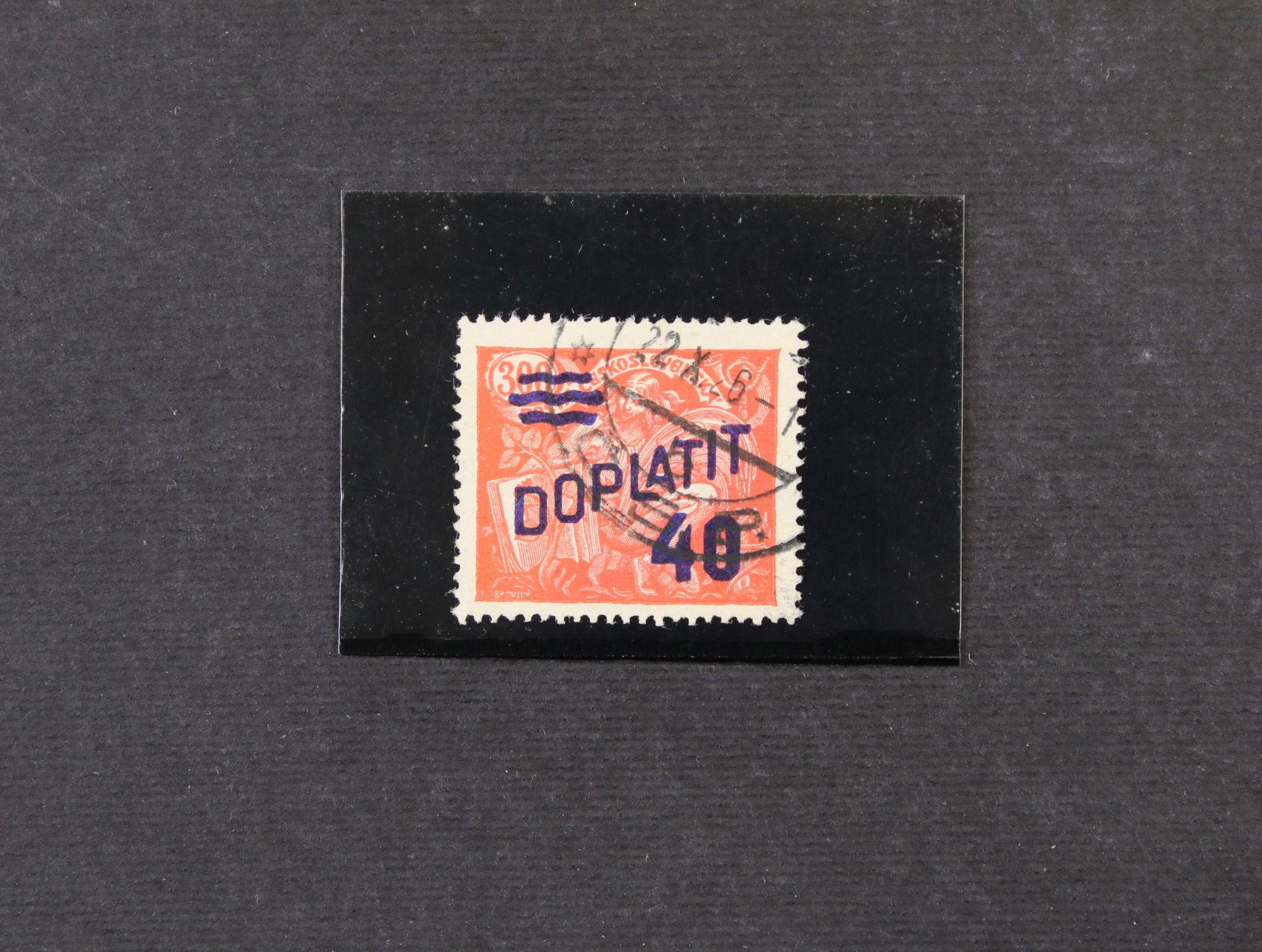 Pohlednice vyfrank. zn. vystřiženou z CDV, poštou neuznané a zatížená 2 ks doplatní zn. č. DL 45