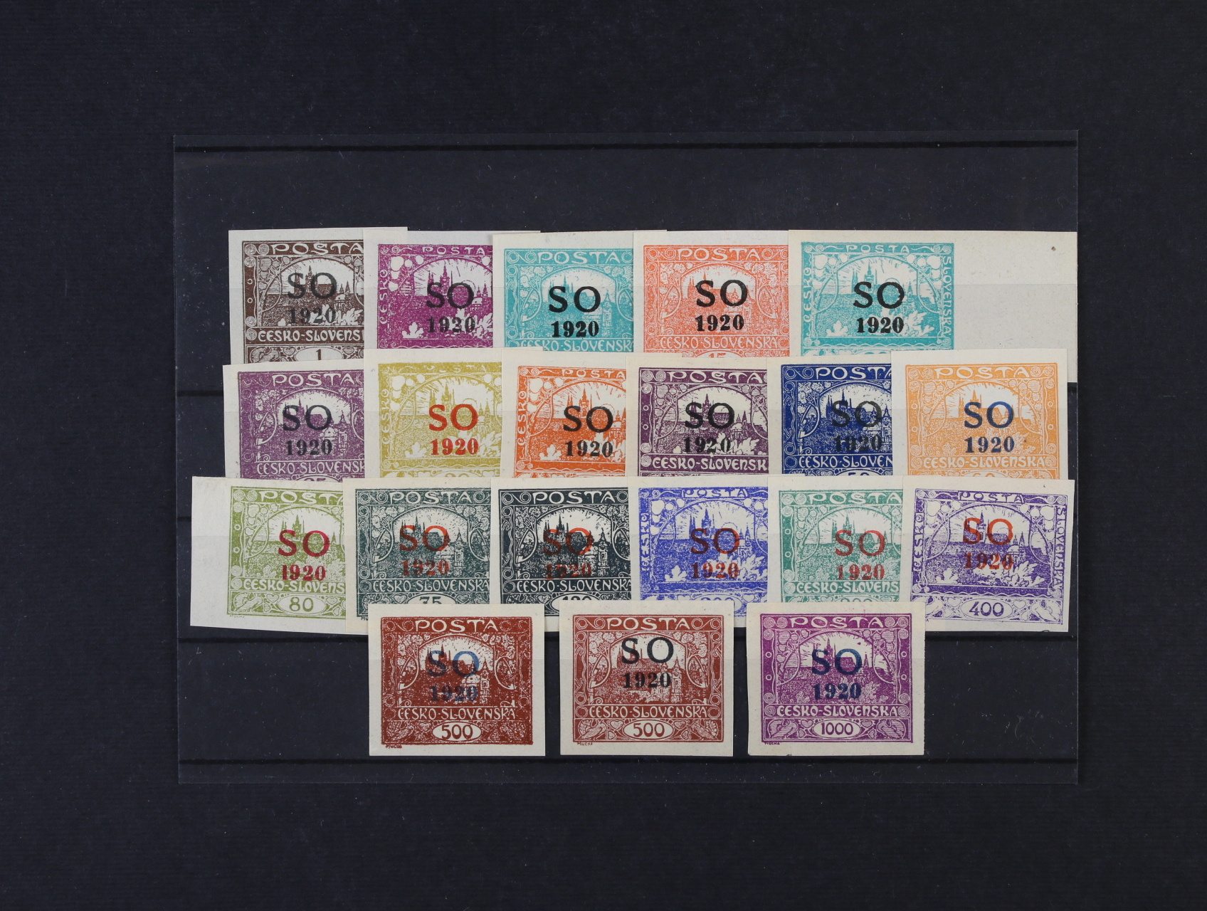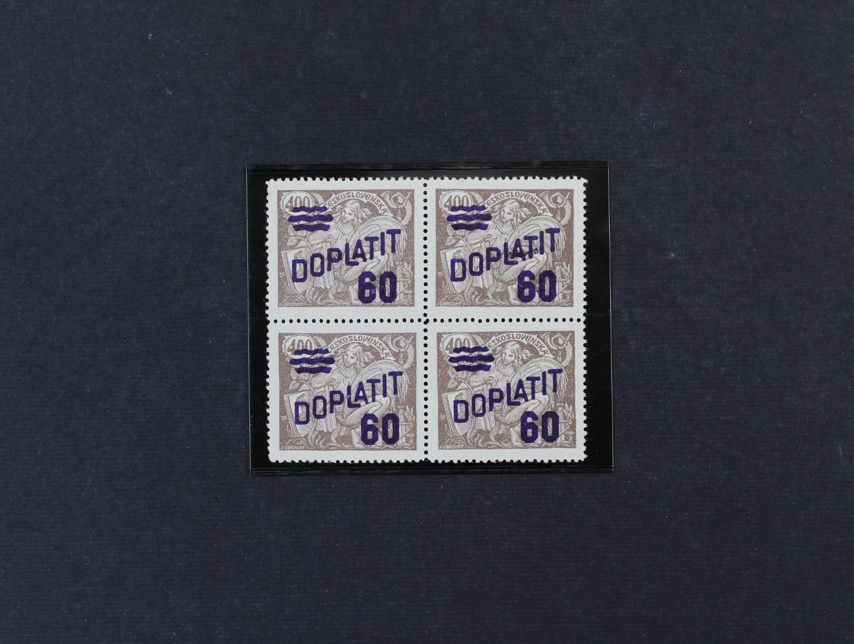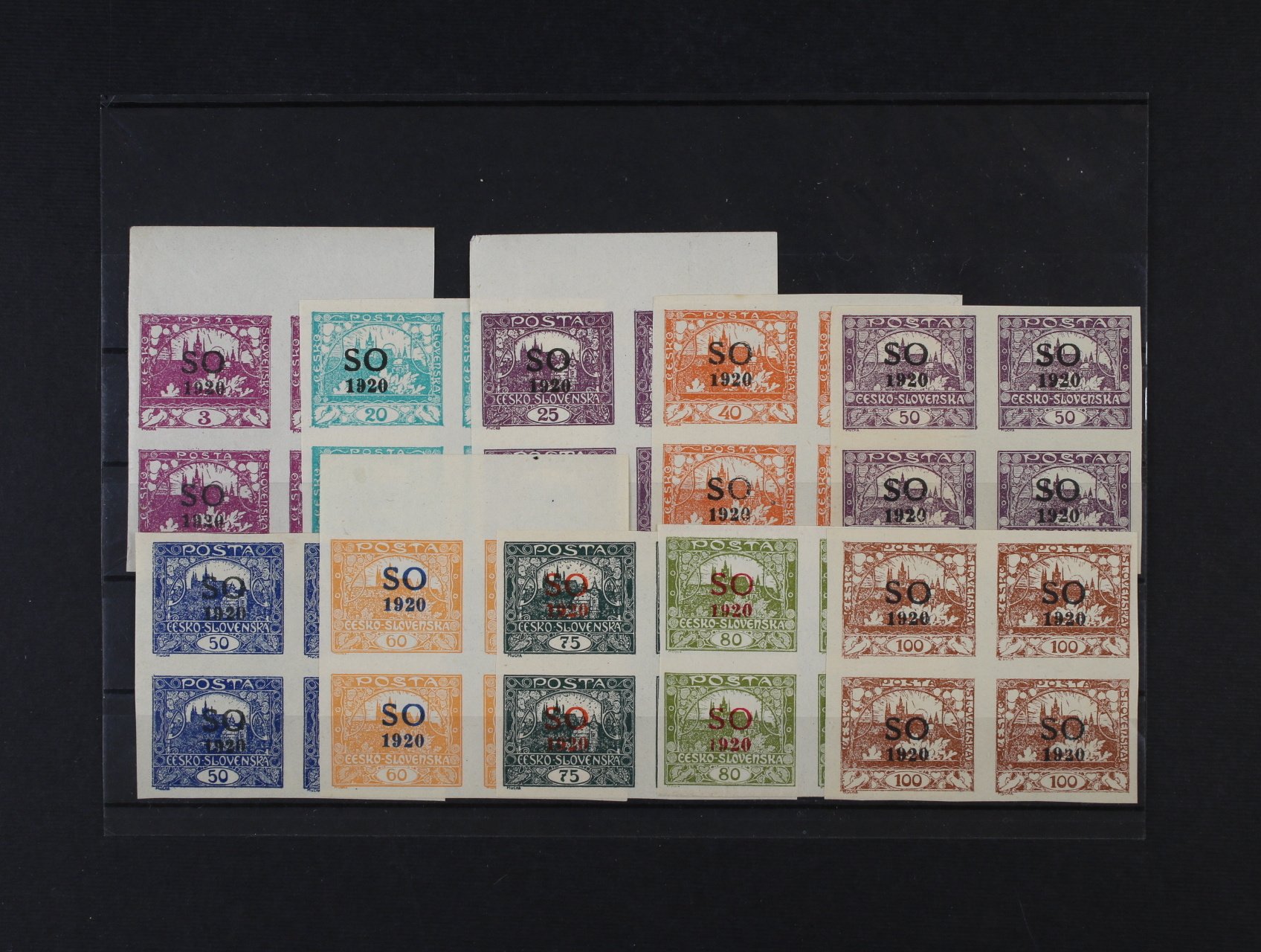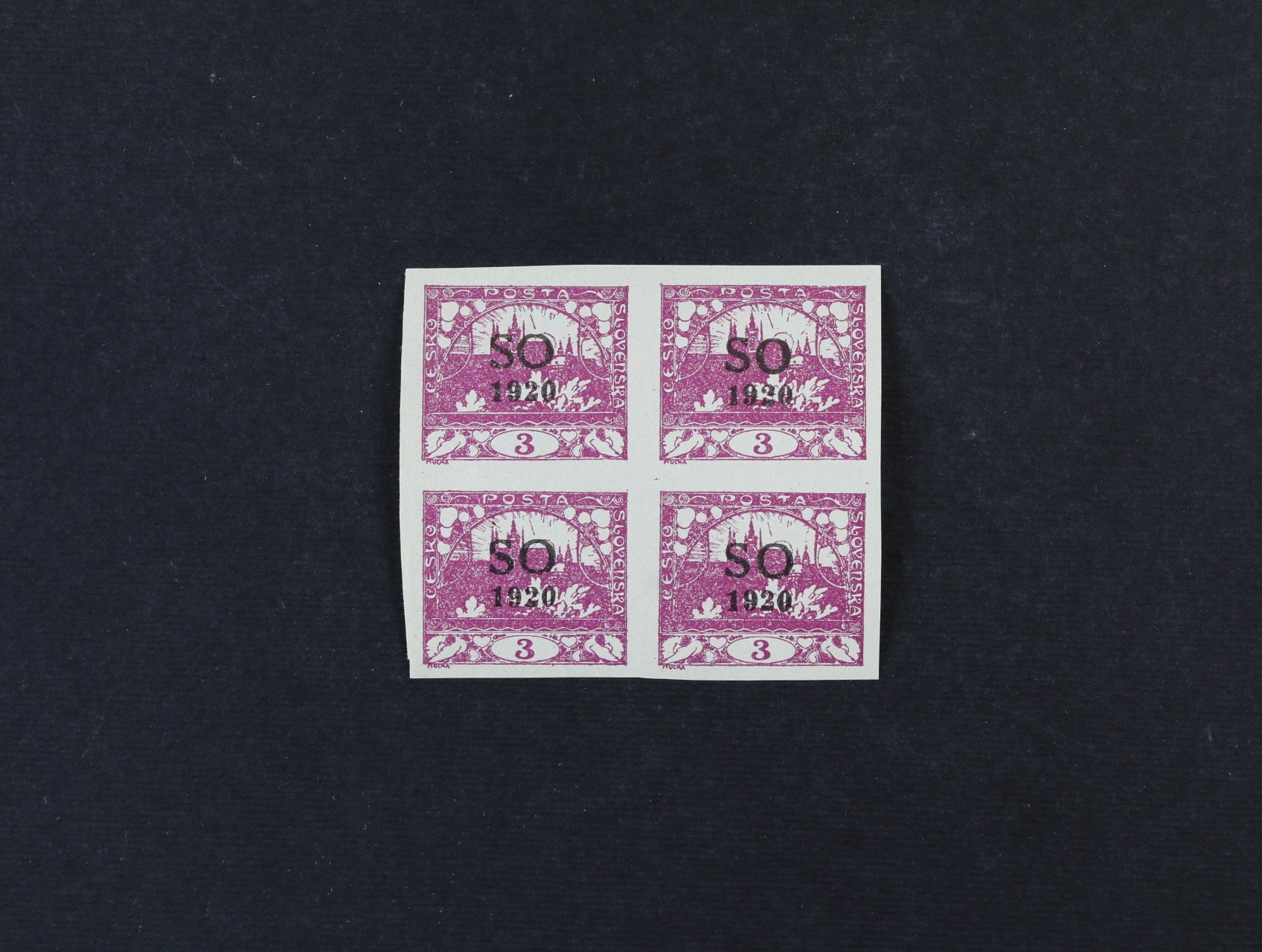 zn. SO č. 2 ve čtyřbloku s ST přetisku široké + úzké O, DV přetisku přerušená číslice 2 v letopočtu
