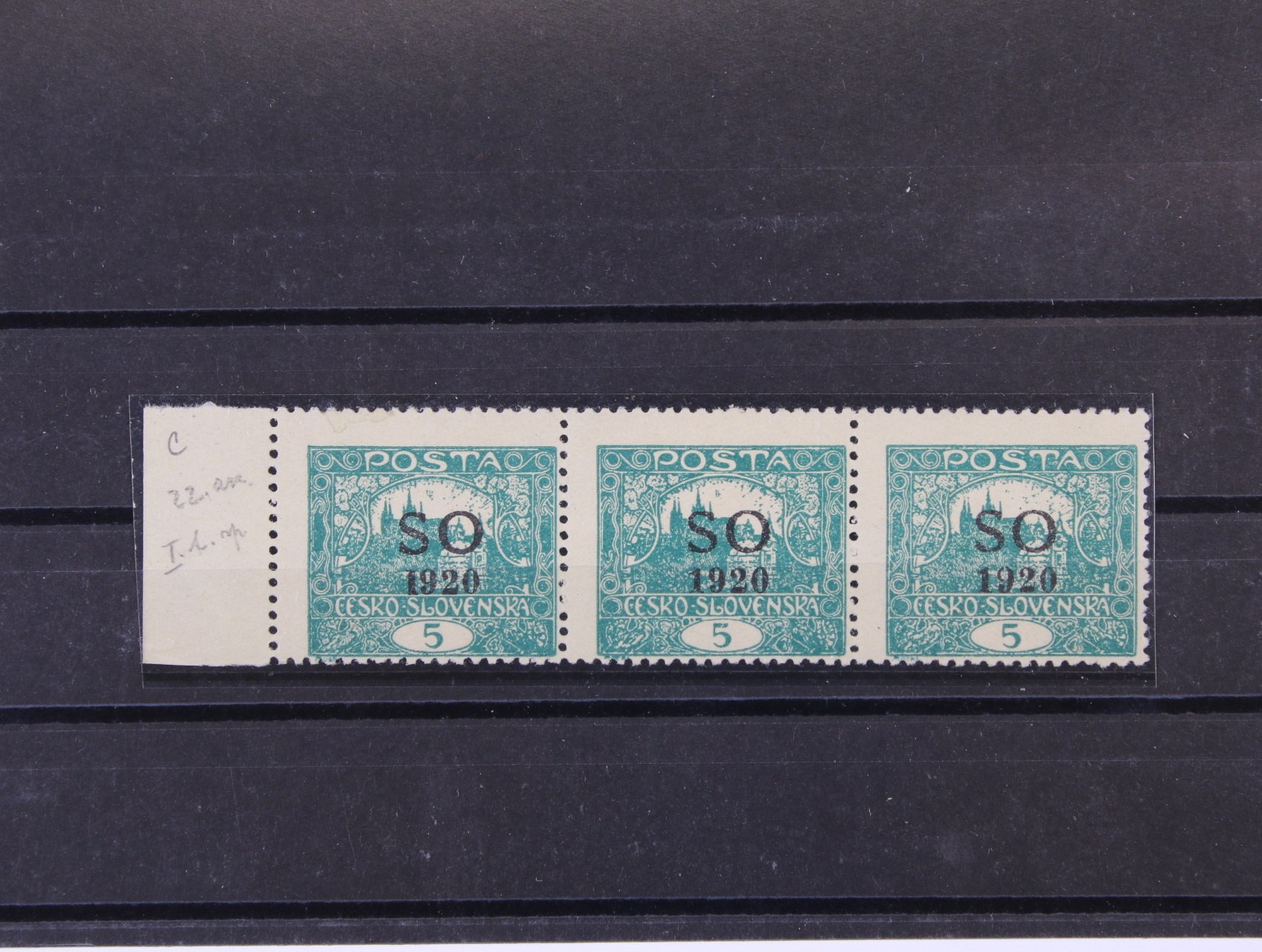 zn. SO č. 3 C STs ve vodorovné třípásce s levým okrajem mírně decentrované, TD 3, ZP 22, zk. Gilbert, kat. cena 10000 Kč, zk. Gilbert, zajímavé, vzácné