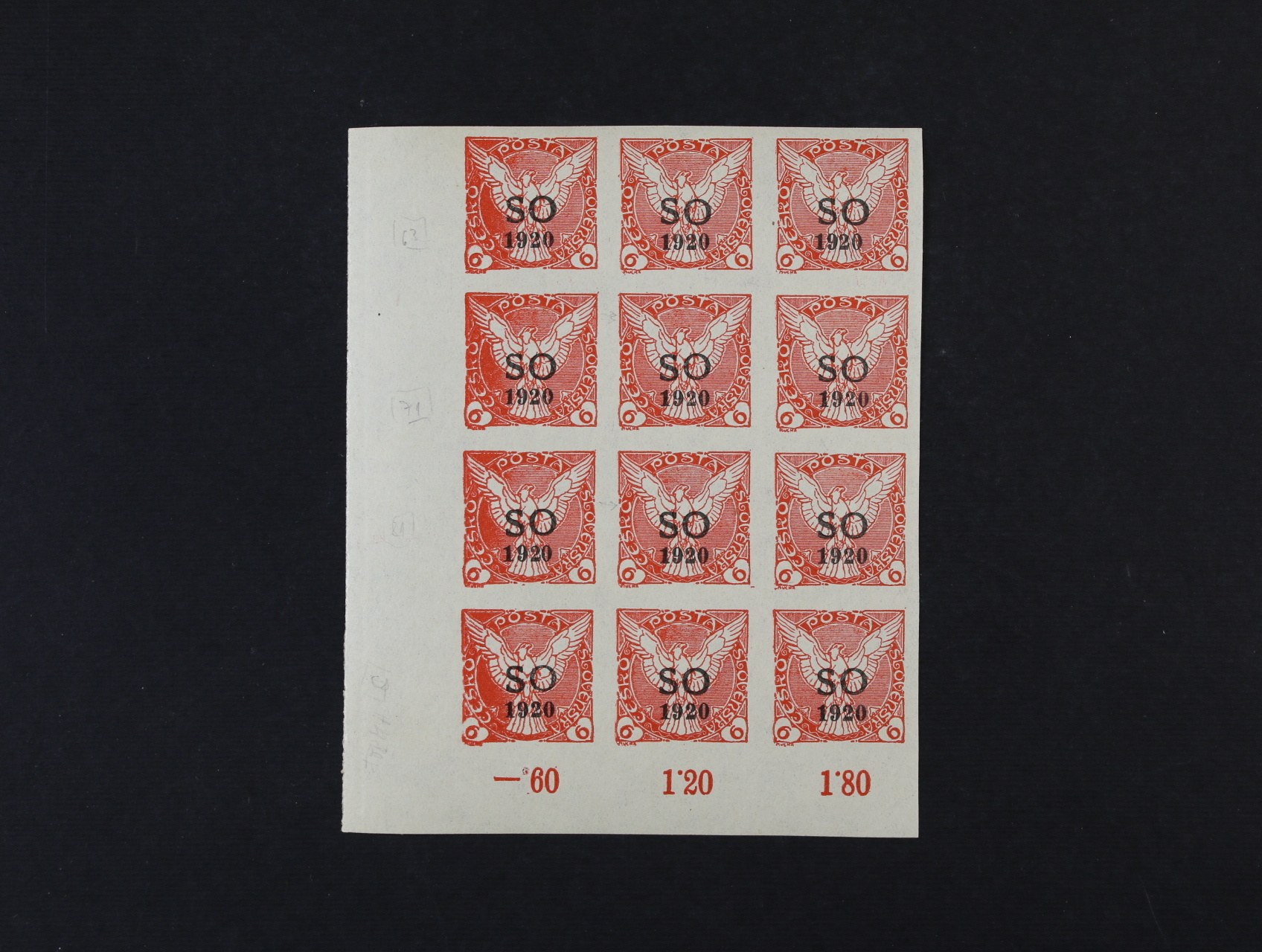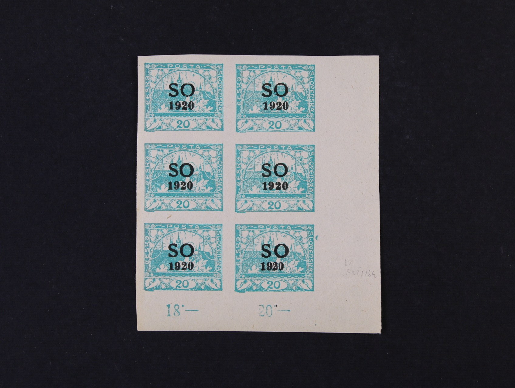 624 zn. SO č. 6 - pravý spodní roh. šestiblok s částečným otiskem hřebu za ZP 100 a užším letopočtem 1920 na ZP 100, zajímavé 300