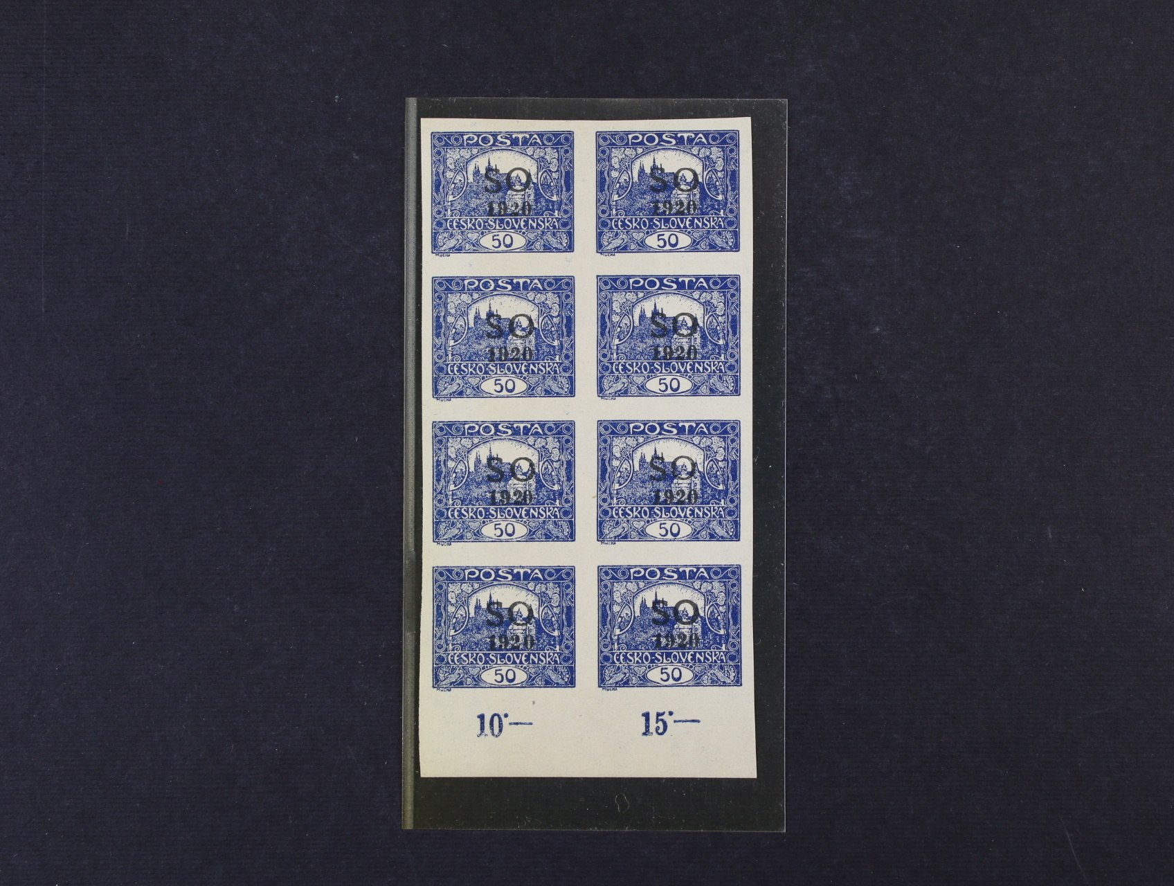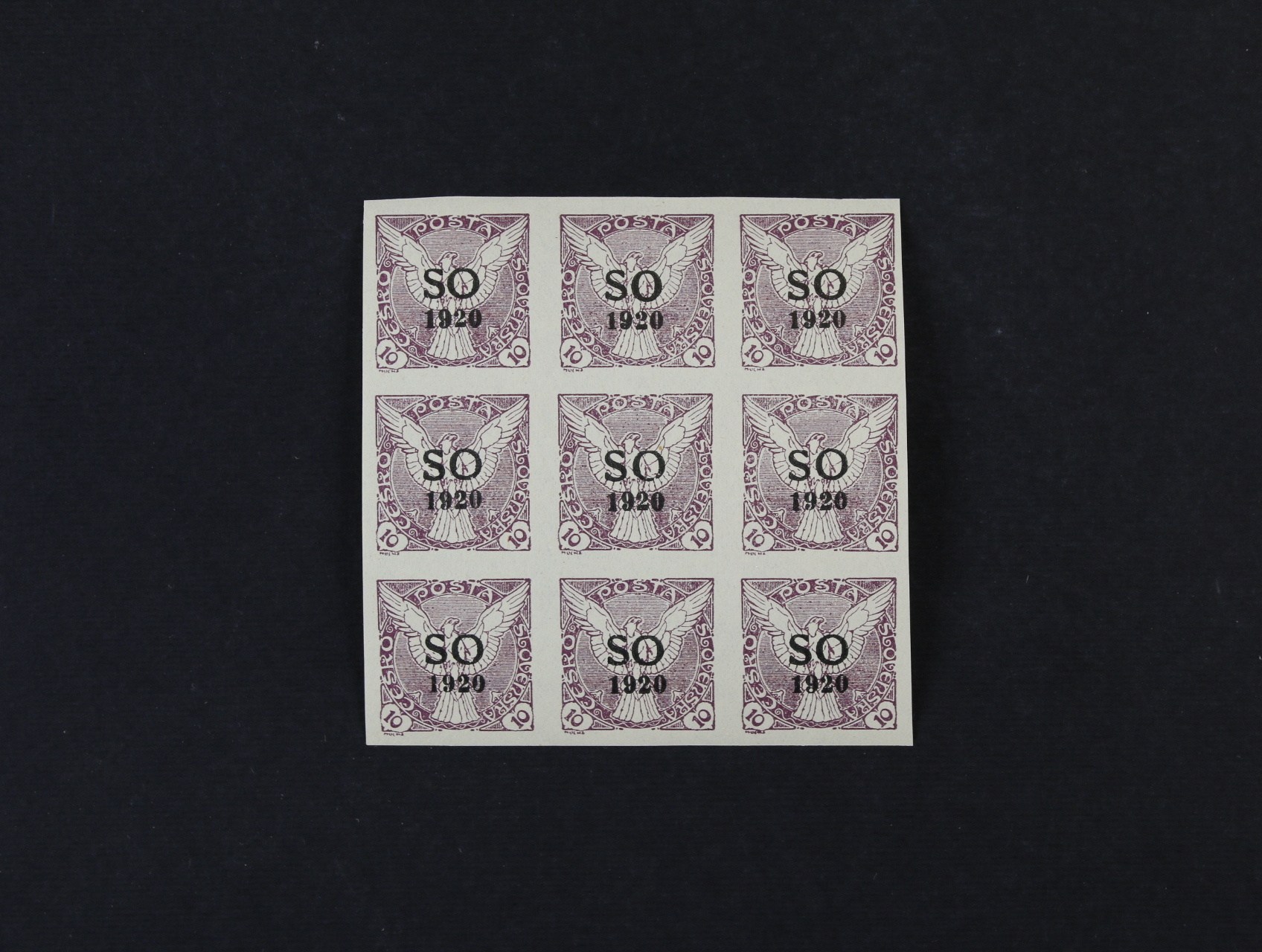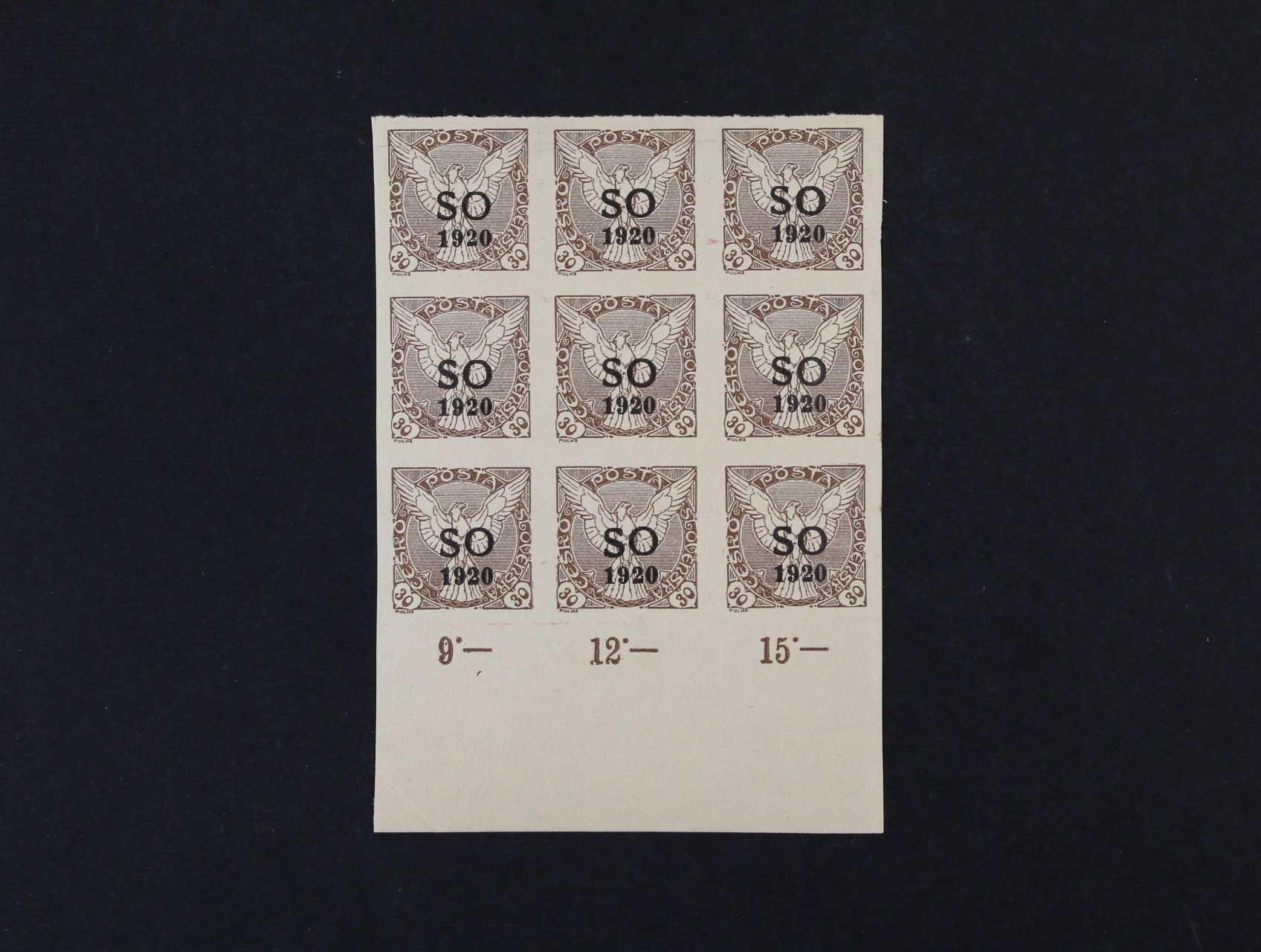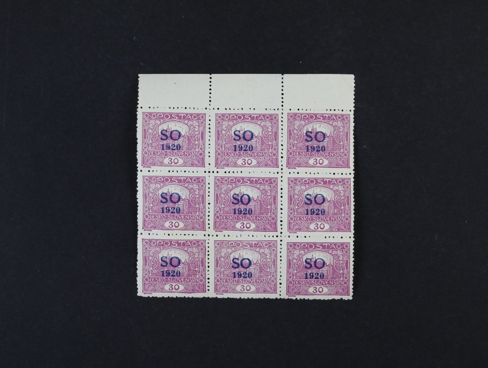 637 zn. SO č. 30 v 9ti-bloku, ST přetisku, na prostřední zn. v horní řadě úzké O 300