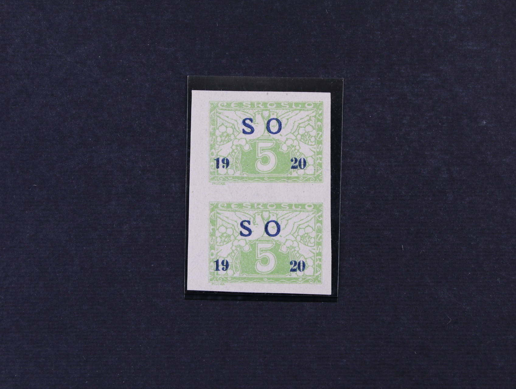 635 zn. SO č. 27 N bílý papír, modrý přetisk ve svislé dvoupásce, nepatrná stopa po nál. na horní zn., lux. střih, zk. Gilbert, Vrba, kat. cena cca 1900 Kč 1400