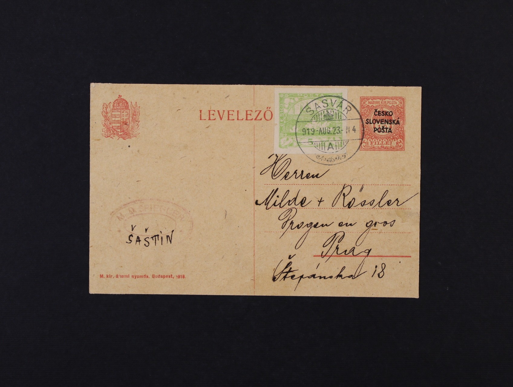 Žilinské vydání - uherský KL 10fil cís. koruna s přetiskem ČESKOSLOVENSKÁ POŠTA do Prahy dofrank. zn. č. 3, pod. raz. SASVÁR (Šaštín) 23.AUG.1919, velmi zajímavé, vzácné