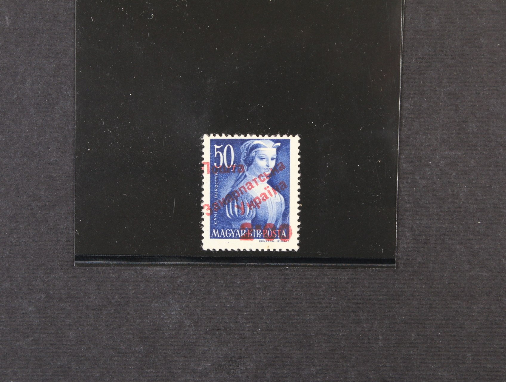 Zakarpatská Ukrajina - zn. U č. 63 II. užhorodské vydání 50f s červeným přetiskem POŠTA ZAKARPATSKÁ UKRAJINA, vydaná v nákladu 139 ks, ZP 5 s posunem přetisku vlevo, zk. Dobej - Szöke, Jurkovič a atest Jurkovič