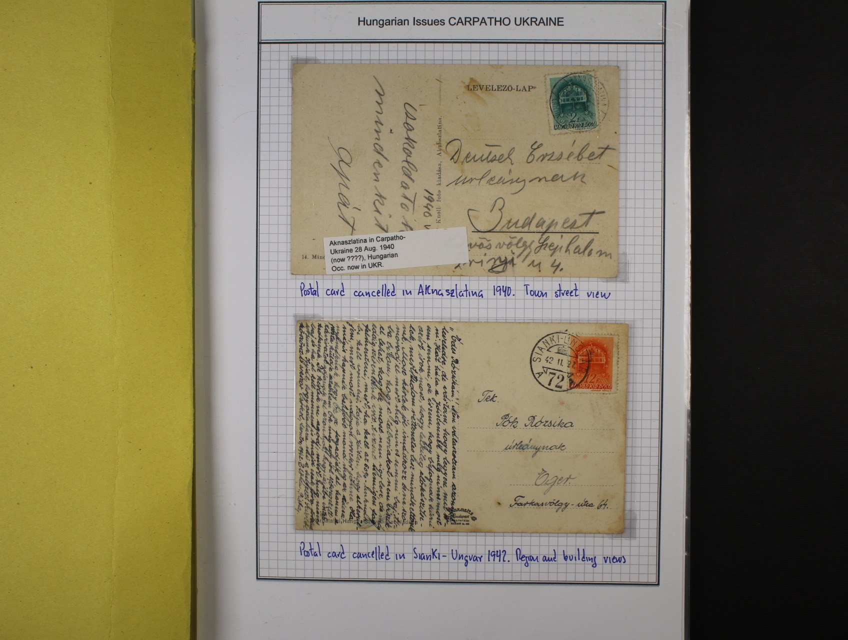 Maďarský zábor 1938 - sestava 7 ks celistvostí, dvou výstřižků s pod. raz. AKNASZLATINA 28.AUG.40, SIANKI - UNGVÁR 27.2.42, UNGVÁR 17.11.38, MUNKÁCS 29.9.38, BEREGSZÁSZ 27.9.38, HUSZT 25.5.40, + úřední formulář Soudní platební oznámení