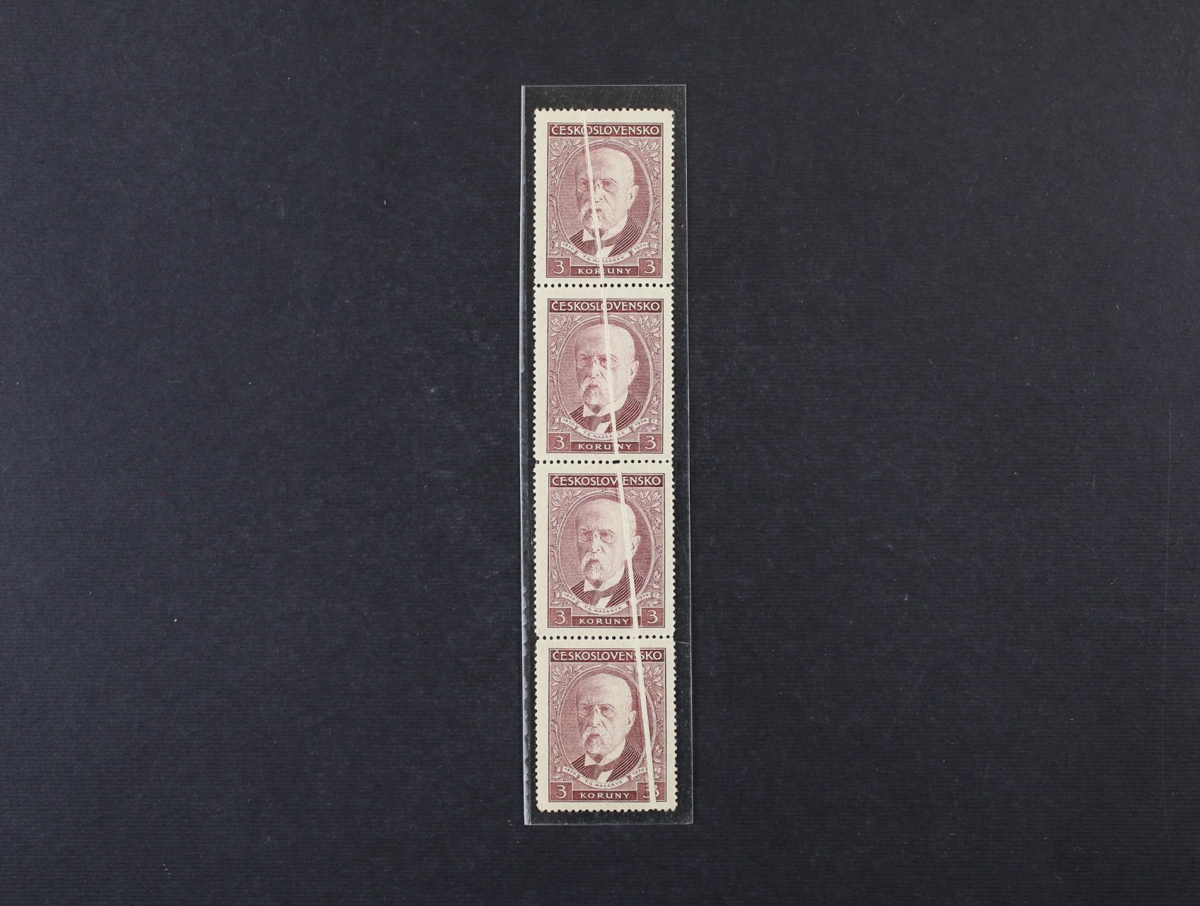 zn. č. 262 3K TGM ve svislé čtyřpásce se svislou širší složkou papíru přes všechny zn.