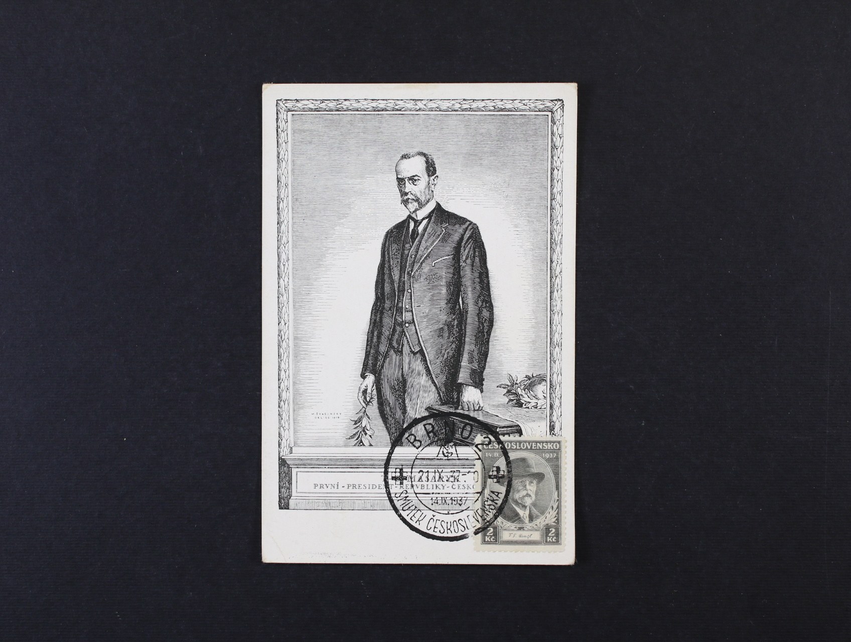jednobar. smuteční pohlednice TGM s vylepenou zn. TGM 2Kč a chybotiskem smutečního raz. BRNO 2 21.9.37 SMUTEK ČESKOSLEVENSKA, zajímavé