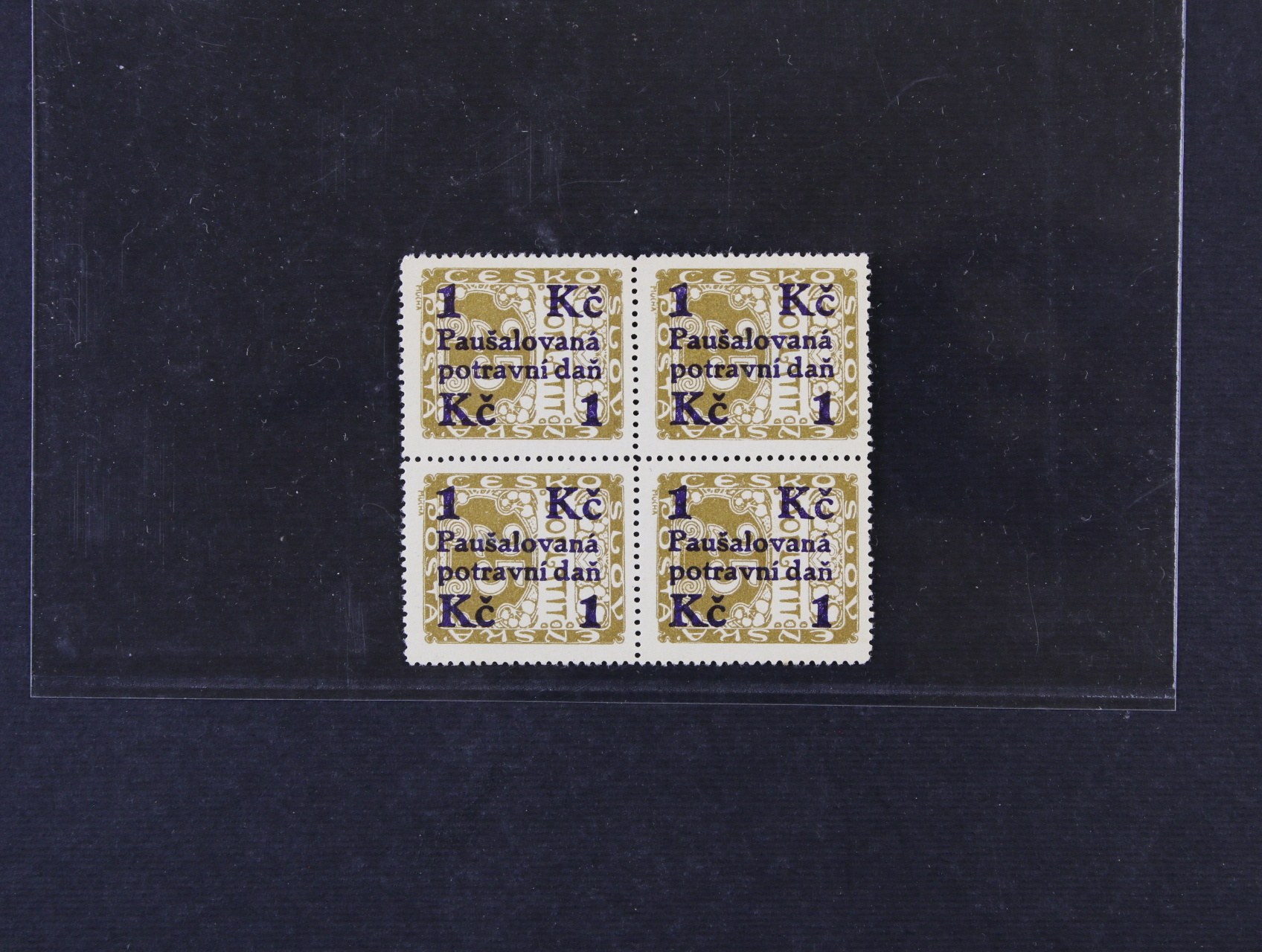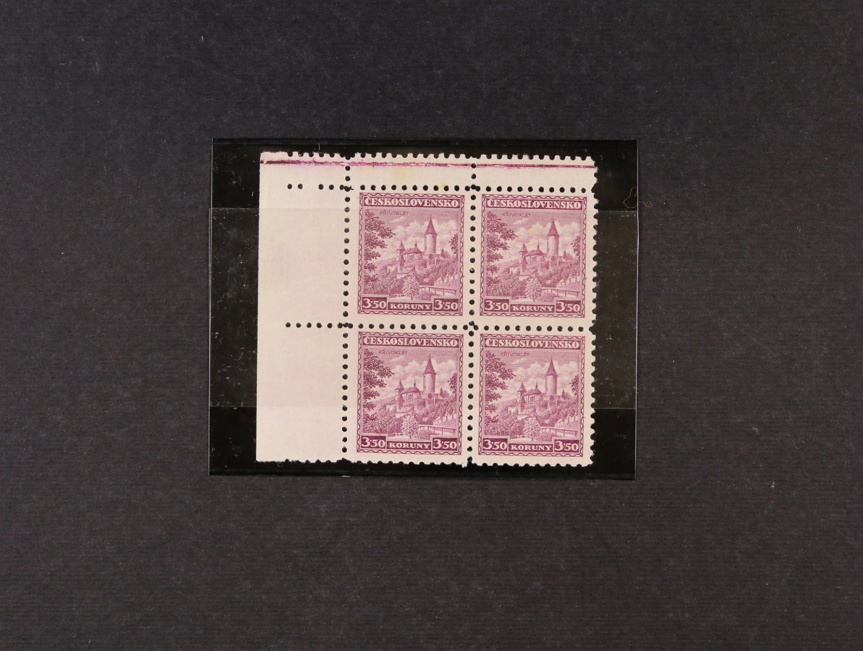 zn. č. 265 - pravý horní roh. čtyřblok s úzkým horním okrajem a dvojitou perforací "kupon" - nerozřezaná spojka archů, mimořádně vzácný výskyt, kat. neuvádí