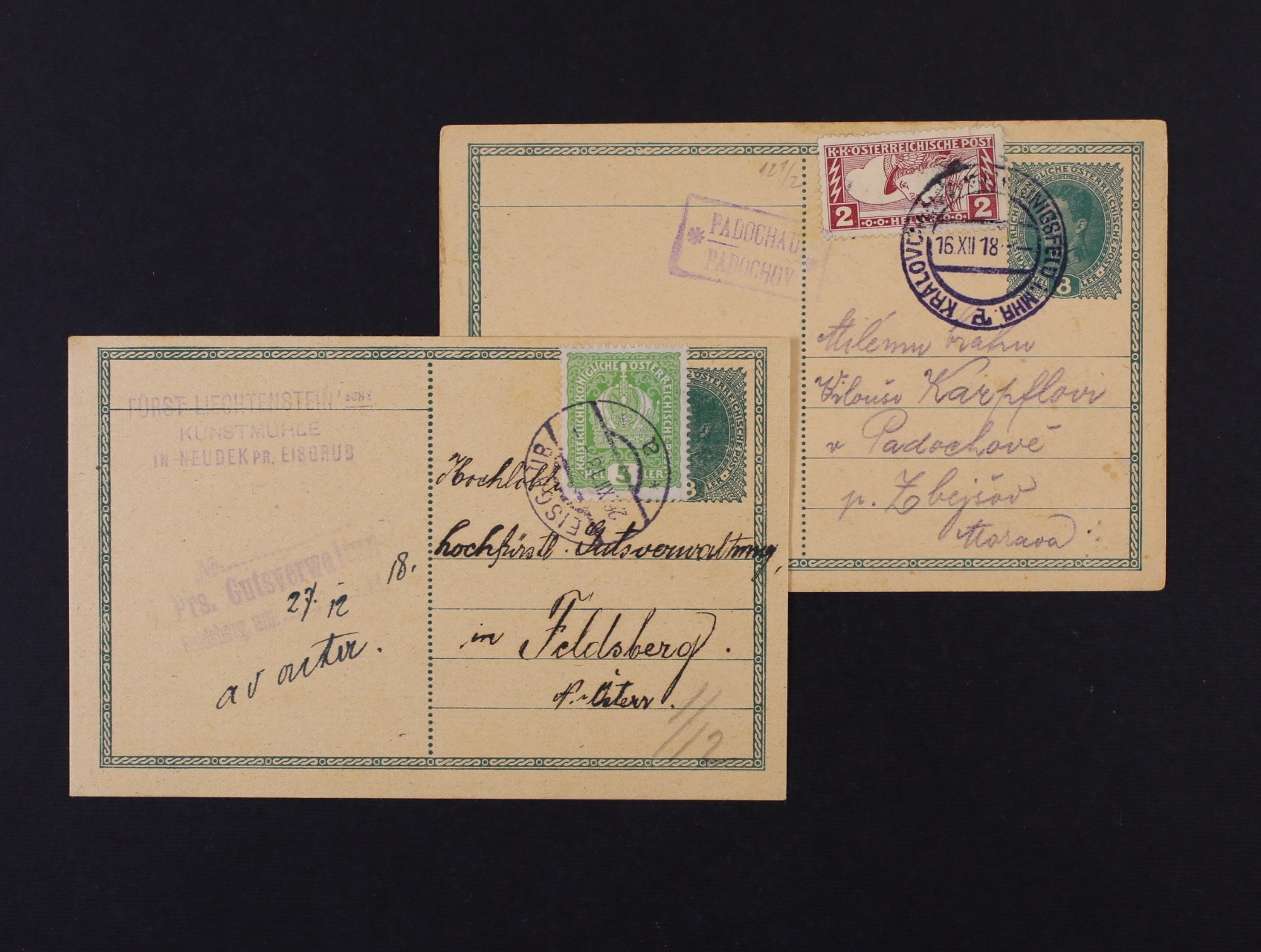 Předběžné, souběžné - dvě rak. celiny Mi. P 235 dofrank. rak. zn. Mi. č. 186, resp. 219 s raz. EISGRUB 26.12.18, resp. KÖNIGSFELD I. MAHR 16.12.18 + rámeč. raz. poštovny PADOCHAU, zajímavé