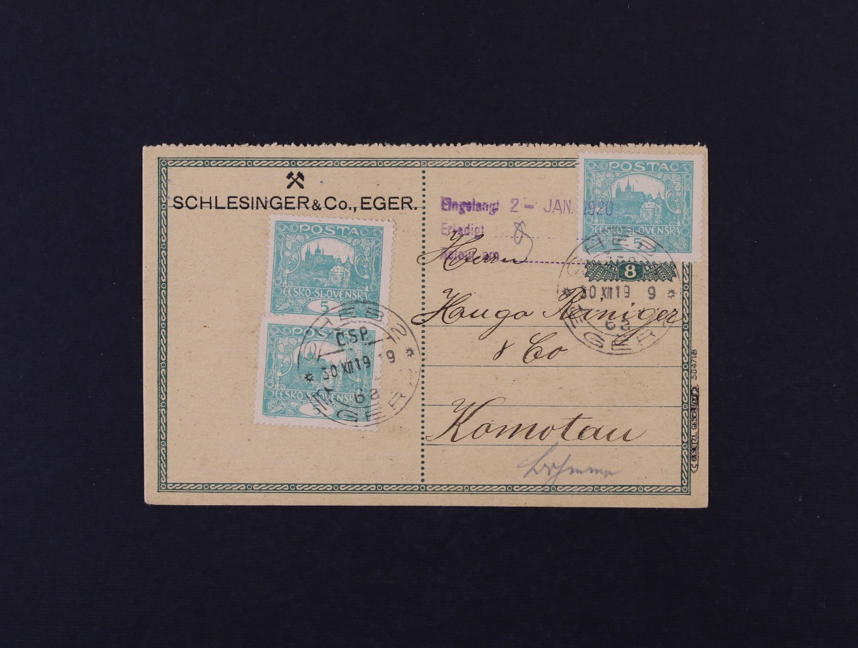 Předběžné, souběžné - rak. celina Mi. P 235 s firemním přítiskem a perforací pro psací stroj frank. zn. č. 4 A (3x), pod. raz. EGER 30.12.19