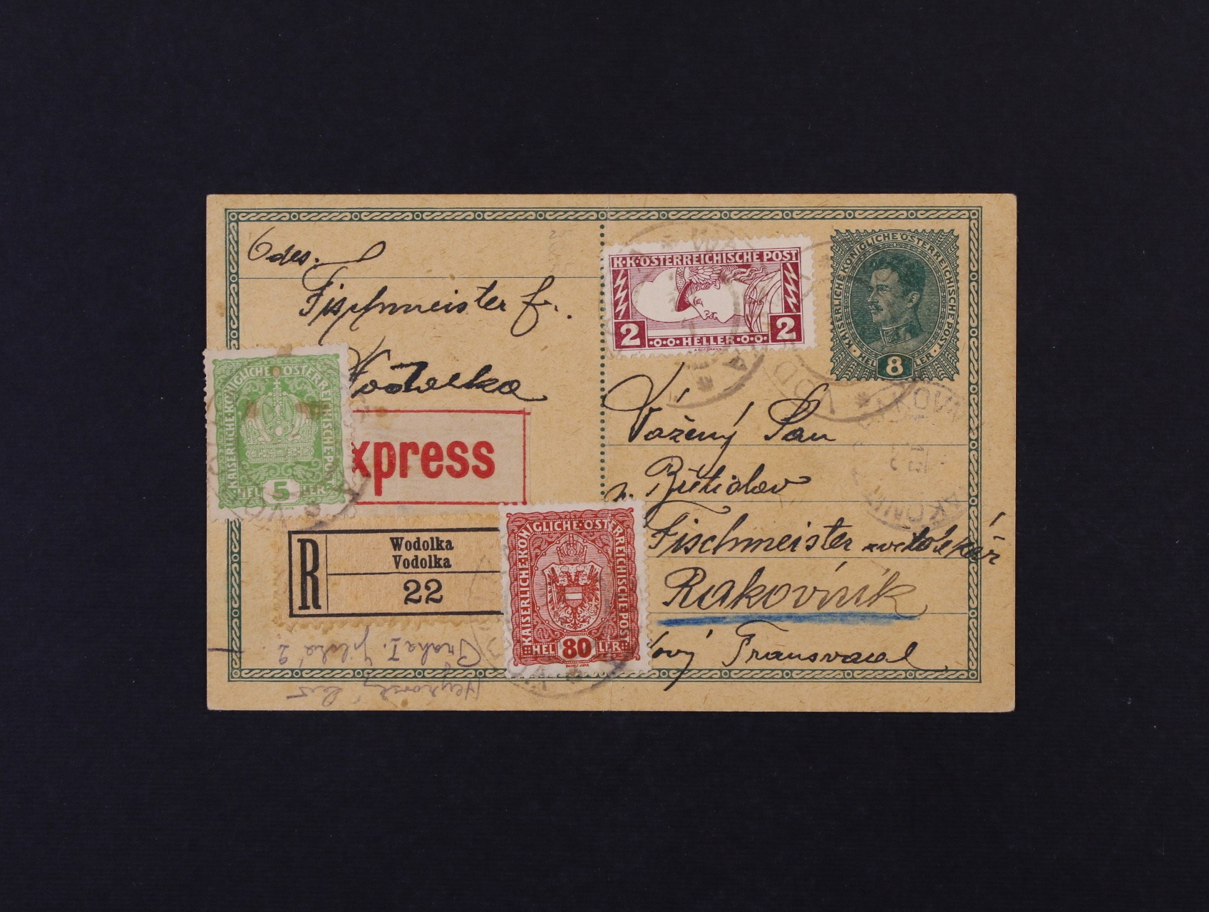 Předběžné, souběžné - rak. KL Mi. P 235 R-EXPRES do Rakovníka, dofrank. rak. zn. Mi. č. 186, 197, 219, pod. raz. VODOLKA 2.12.18 + přích. raz.