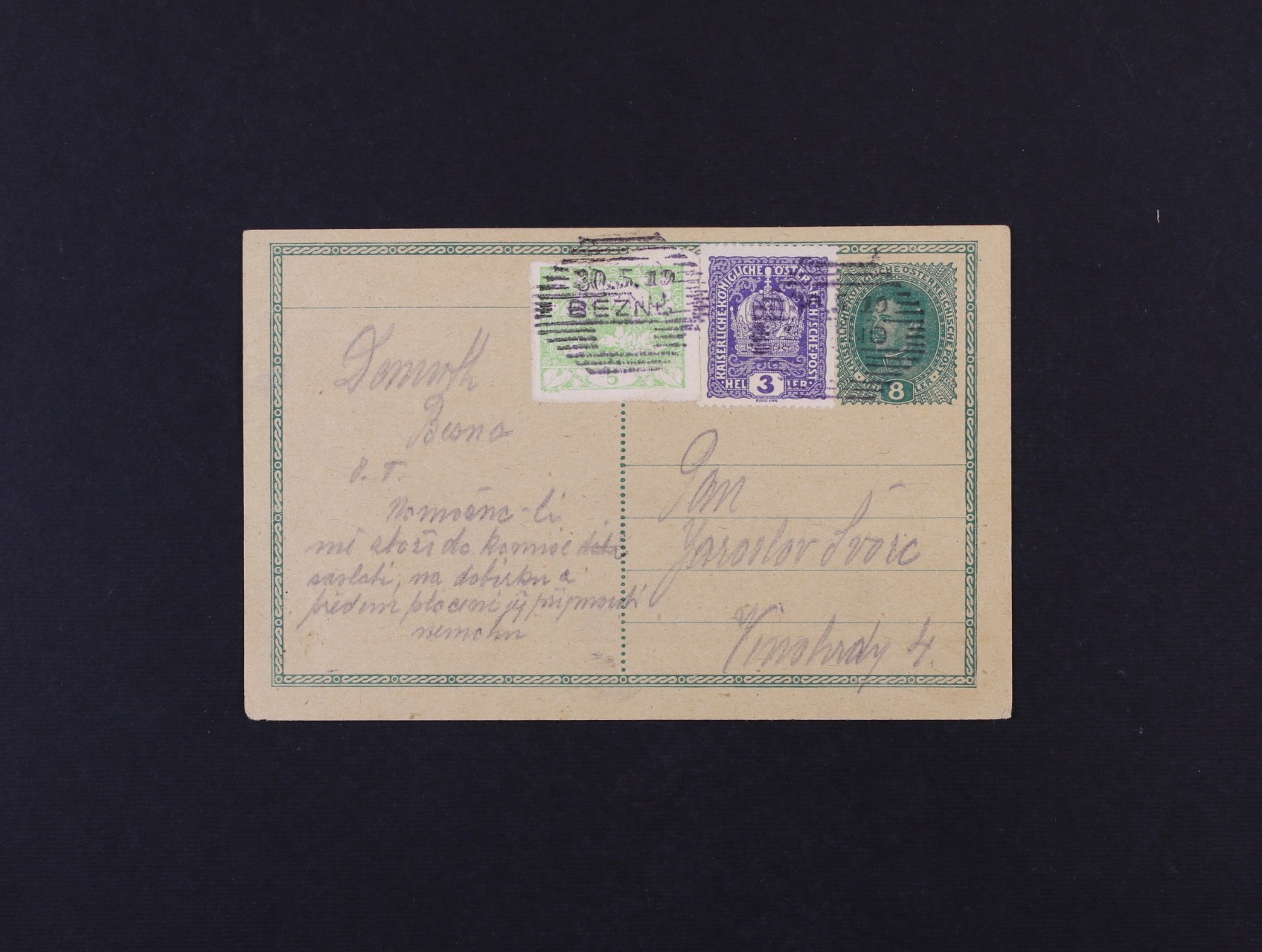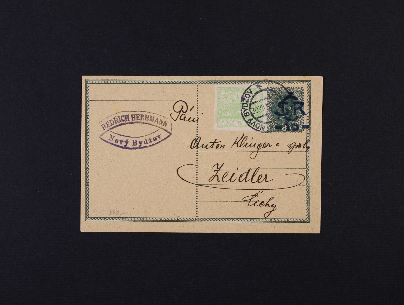 CDV č. 1b modrý přetisk, dofrank. zn. č. 3, pod. raz. NOVÝ BYDŽOV 30.7.19, dobrá kvalita, zajímavé
