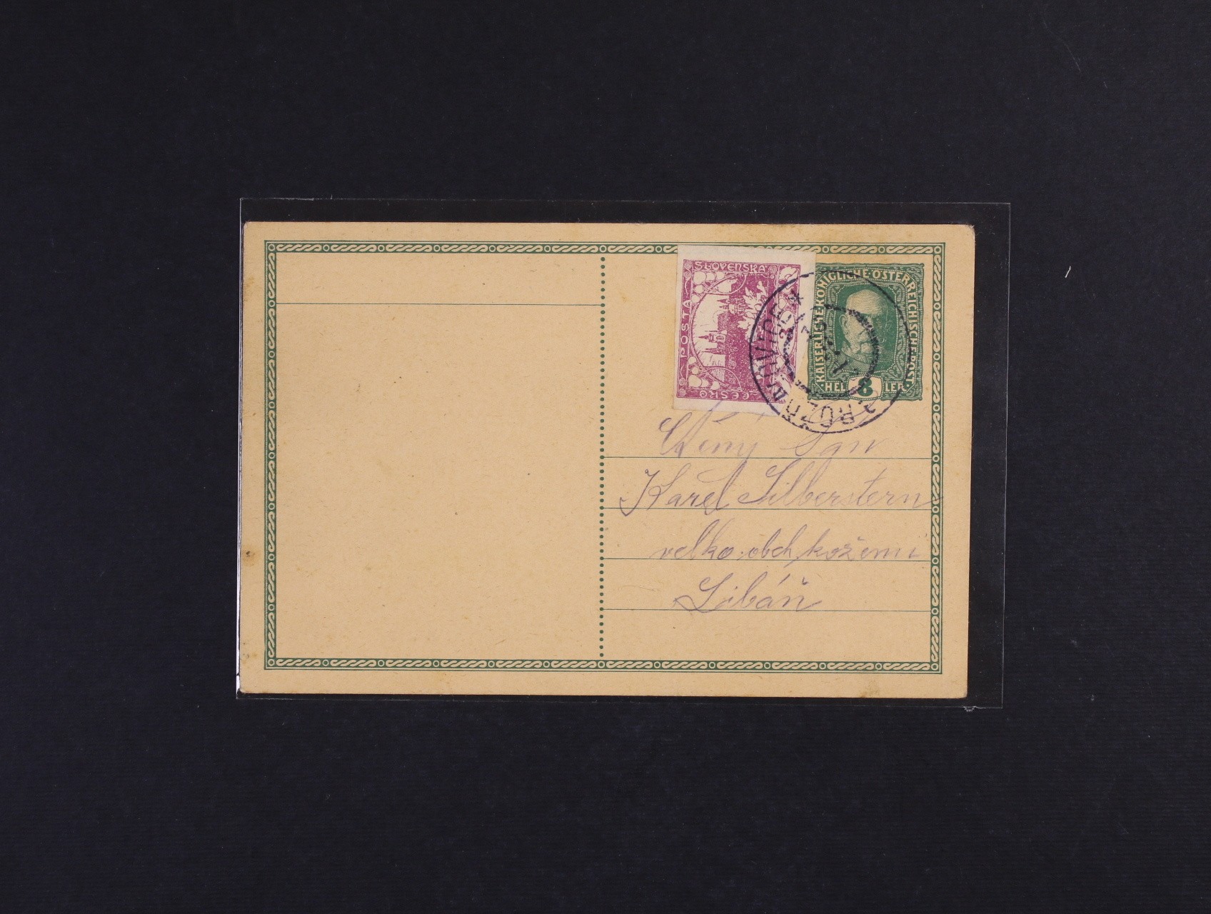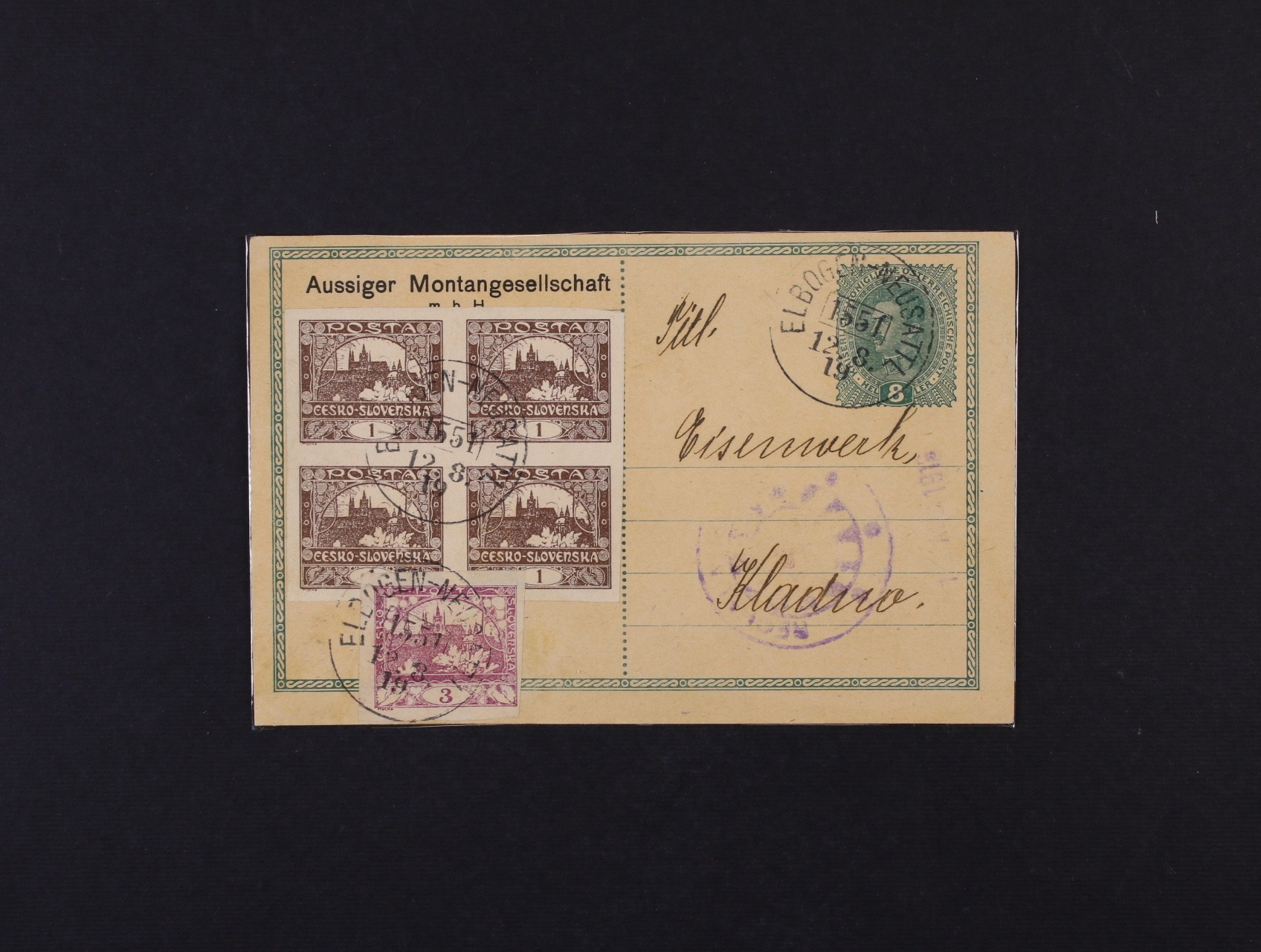 Předběžné, souběžné - rak. celina Mi. P 235 dofrank. rak. zn. Mi. č. 185 + čs. zn. č. 3, pod. linkové raz. BREZNO 20.5.19, lux. kvalita, dekorativní
