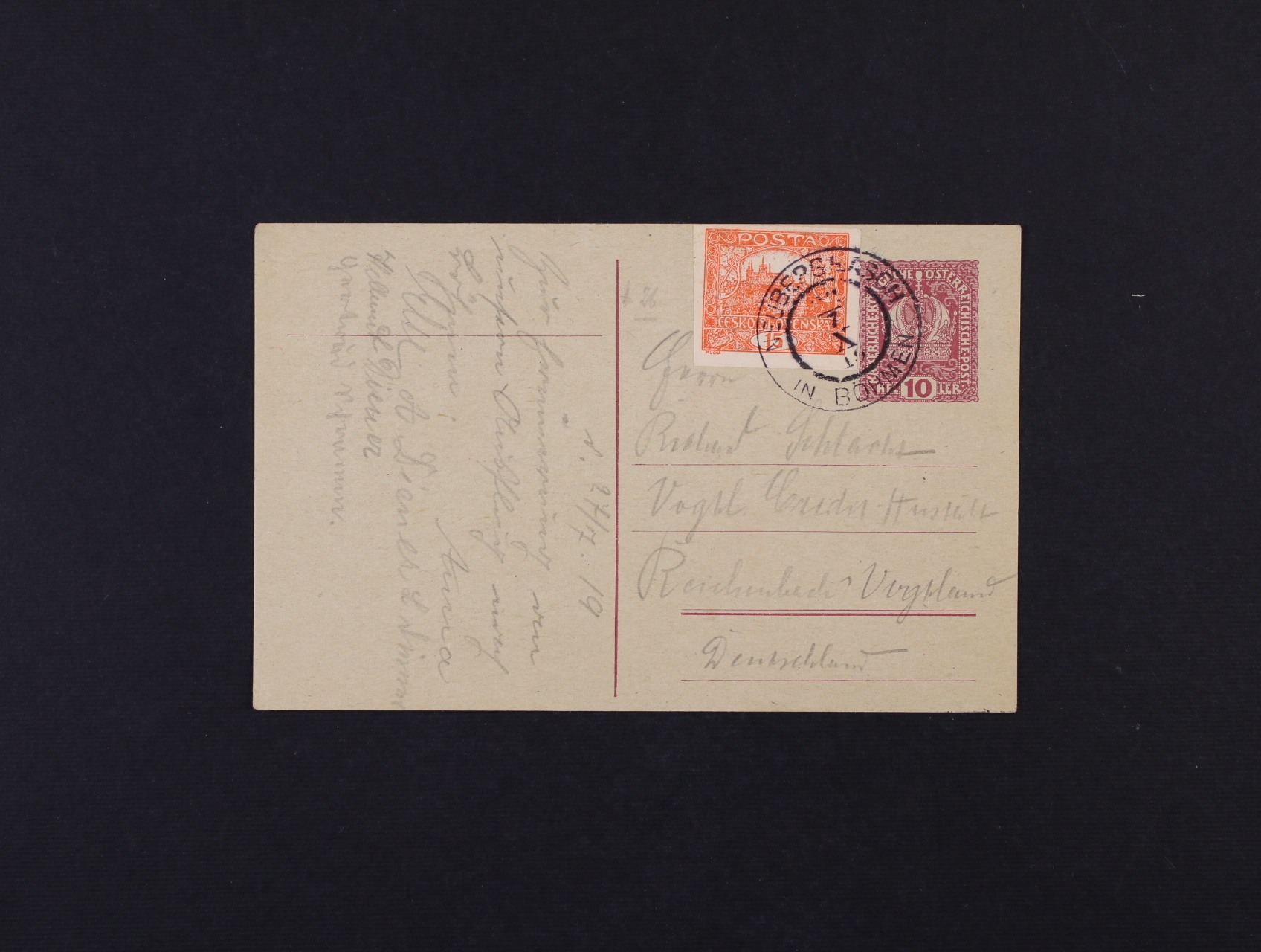CDV č. 1 se silně posunutým přetiskem vlevo až mimo zn., dofrank. zn. č. 3 s DV prodloužený oblouček číslice 5, pod. raz. WARNSDORF 12.8.19
