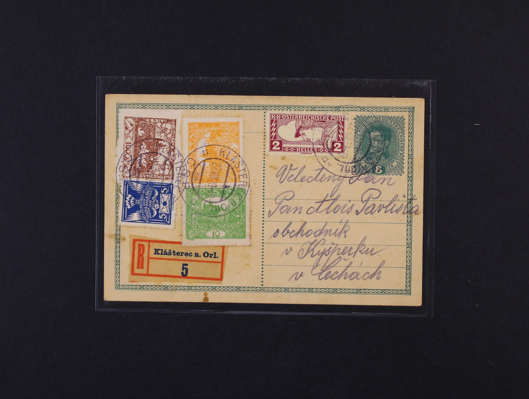 Předběžné, souběžné - rak. R-celina Mi. P 235 dofrank. rak. zn. Mi. č. 219 + čs. zn. č. 6 C, 17 B, 29, OR 5h modrá, pod. raz. KLÁŠTEREC NAD OHŘÍ 27.8.20