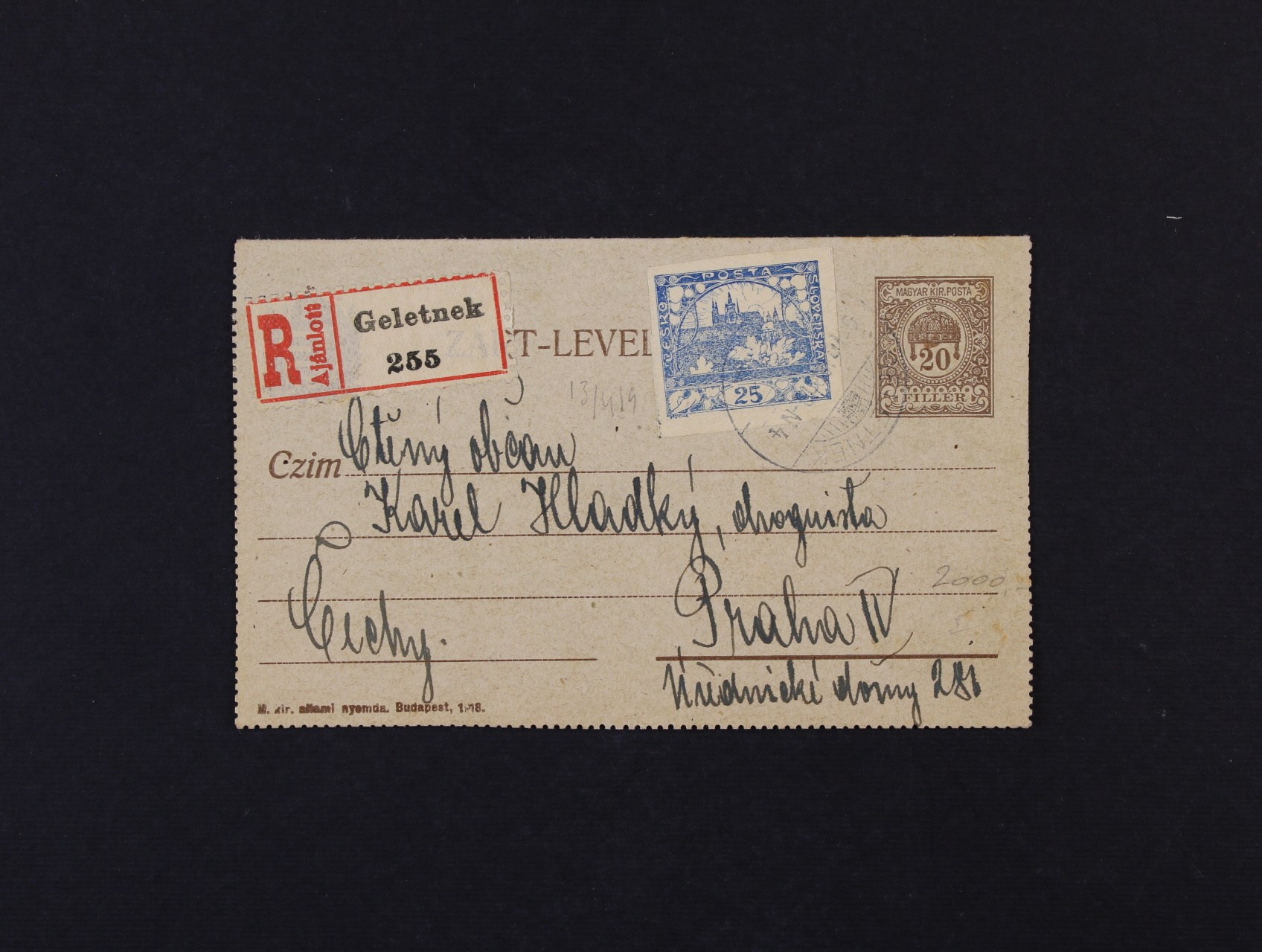 Předběžné, souběžné - maď. zálepka 20fil RECO do Prahy, dofrank. zn. č. 10, pod. raz. GELETNEK (Hliník nad Hronom) 13.4.19, zajímavé, vzácné