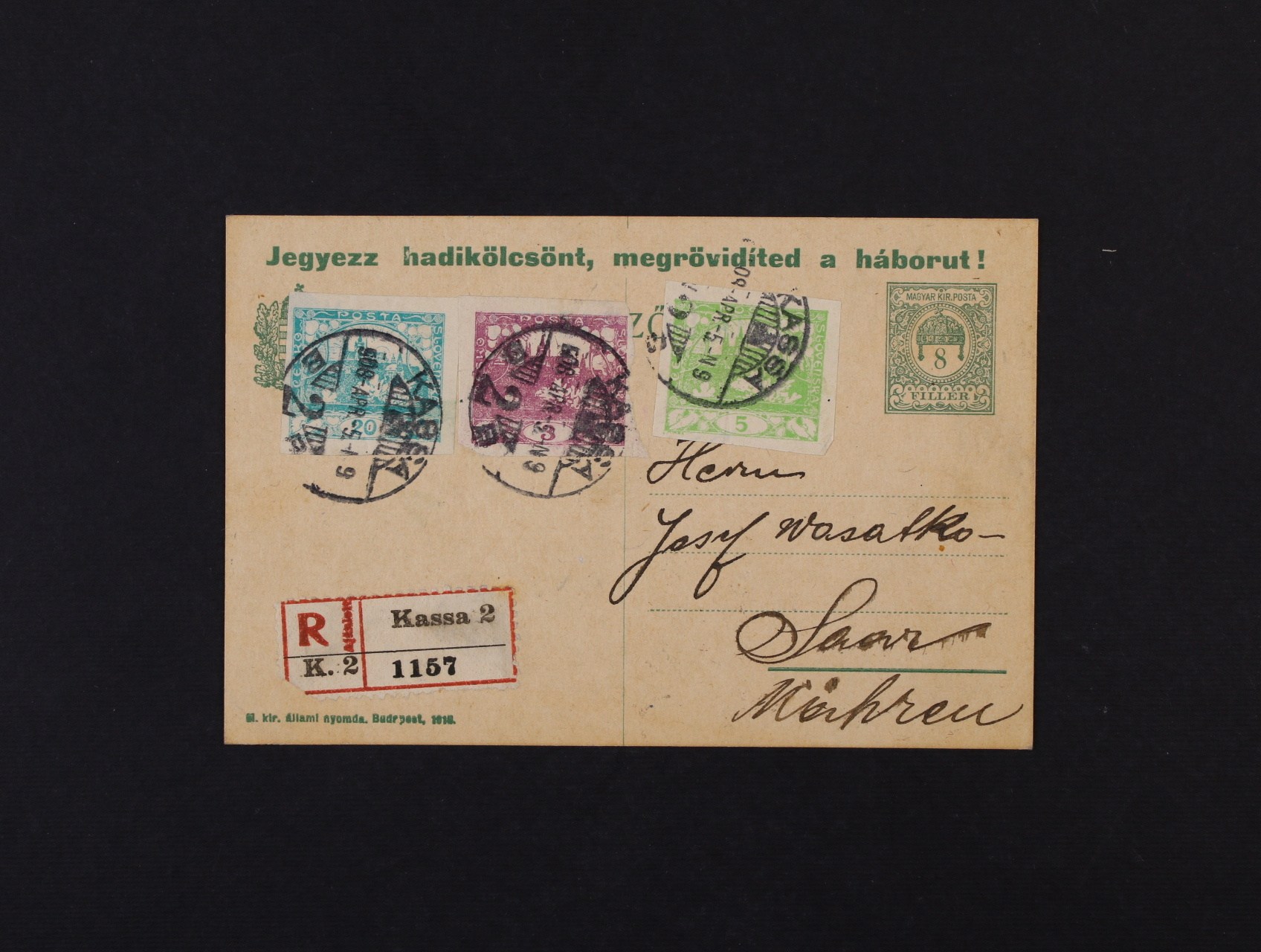 Předběžné, souběžné - maď. KL 8fil cís. koruna RECO do Žďáru, dofrank. zn. č. 2, 3, 8, pod. raz. KASSA 5.APR.19