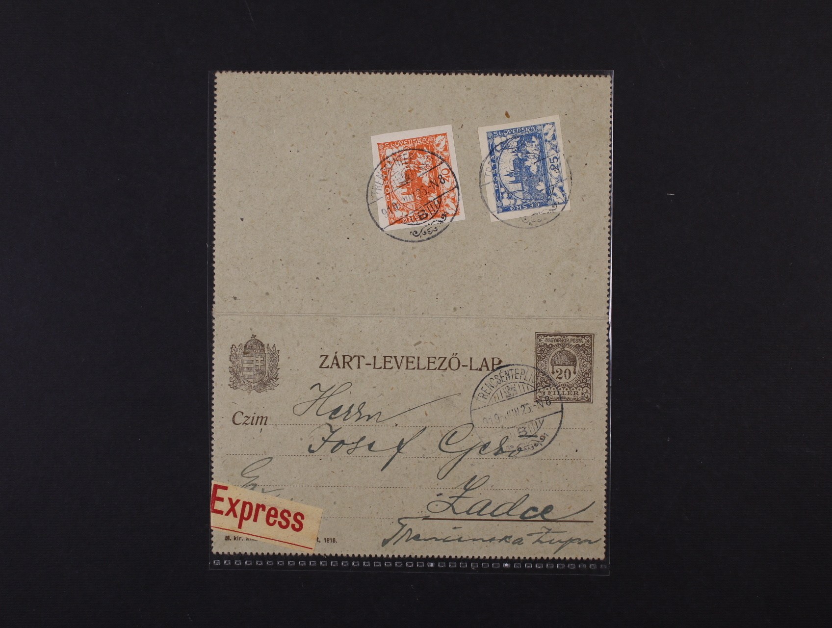 Předběžné, souběžné - maď. zálepka 20fil EXPRES do Ladce, dofrank. zn. č. 10 + 14, pod. raz. TRENCSÉN TEPLICZ 26.JAN.19, zajímavé, vzácné