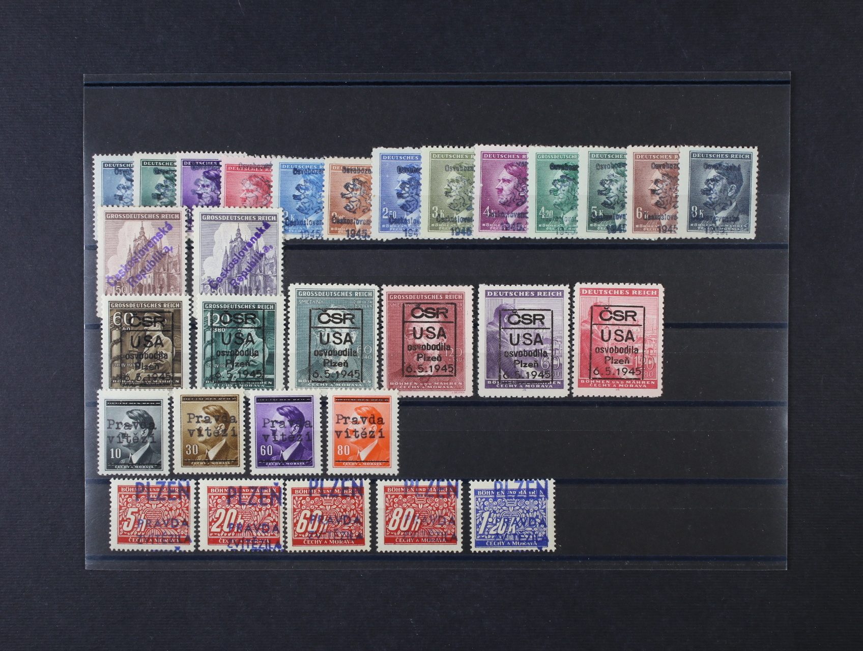 Plzeň III., IV., V., VI., VIII. - sestava 30ks protektor. zn. A. H., chrám sv. Víta, 55. nar. A. H., B. Smetana, 54. nar. A. H., doplatní