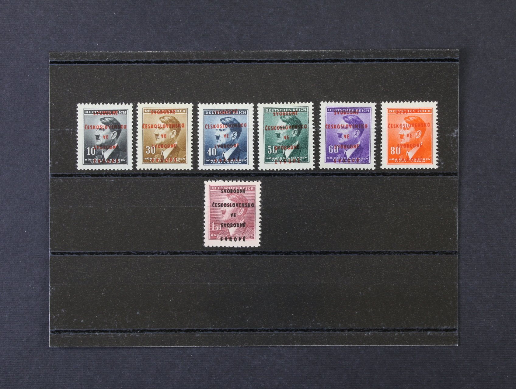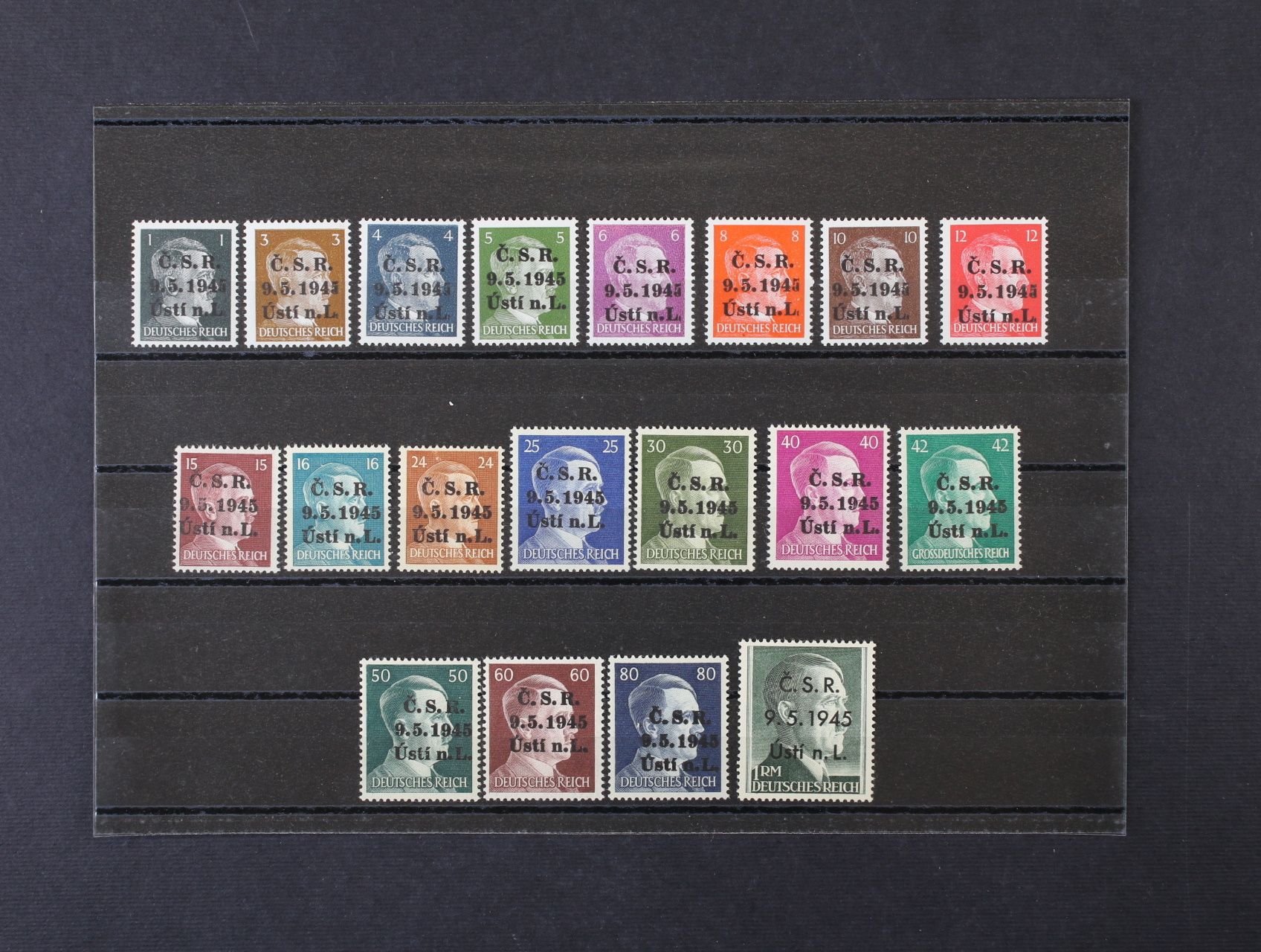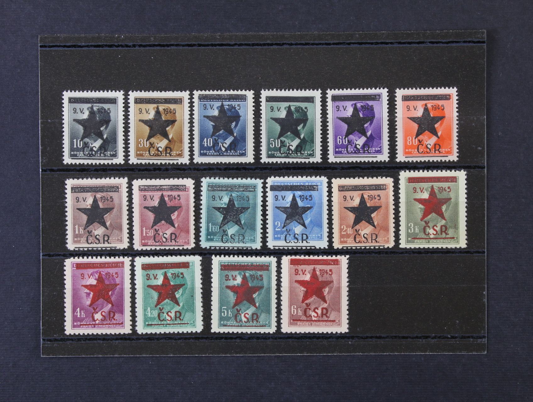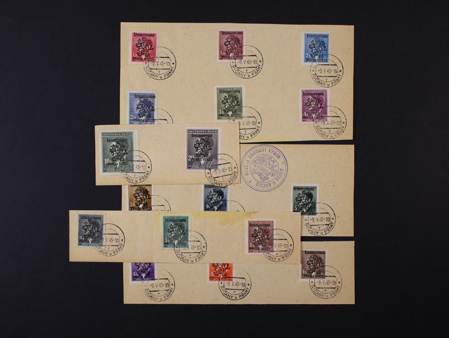 Říčany u Prahy - sestava výstřižků s 17ks protektor. zn. A. H. s přetiskem ČESKOSLOVENSKO PRAVDA VÍTĚZÍ, raz. 9. V. 45