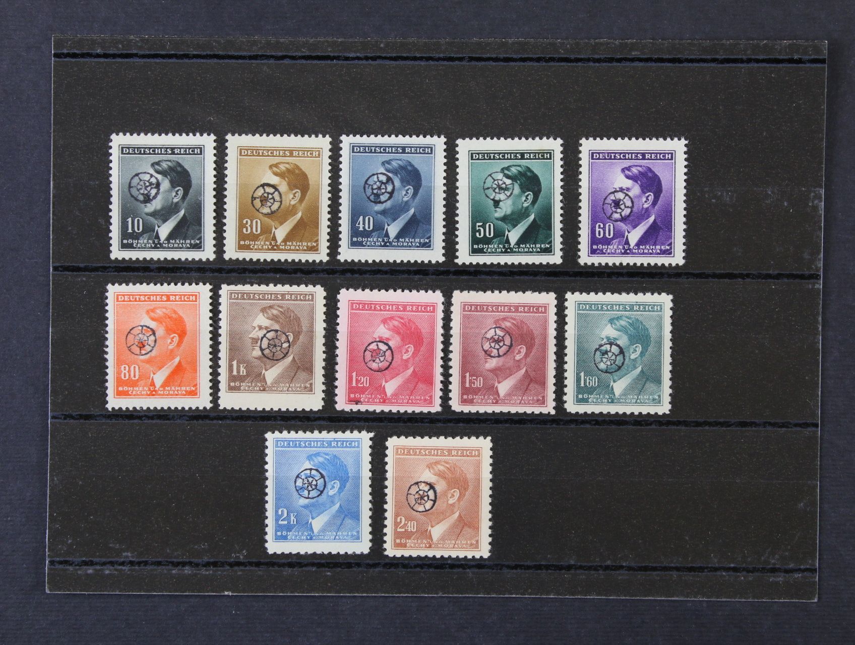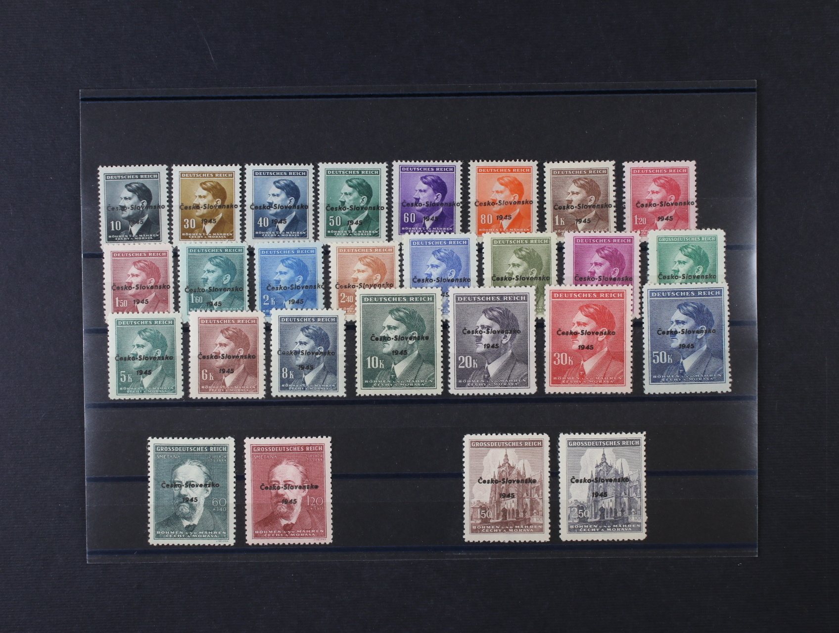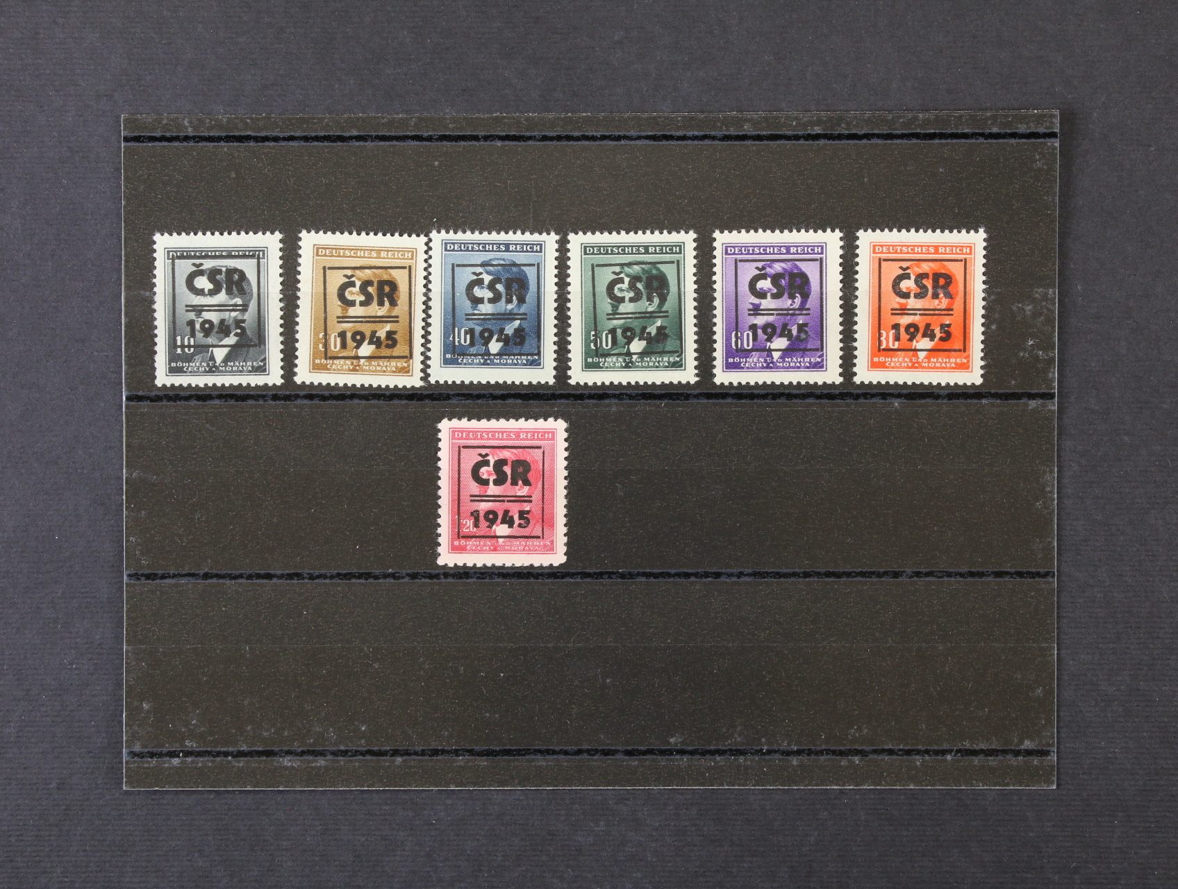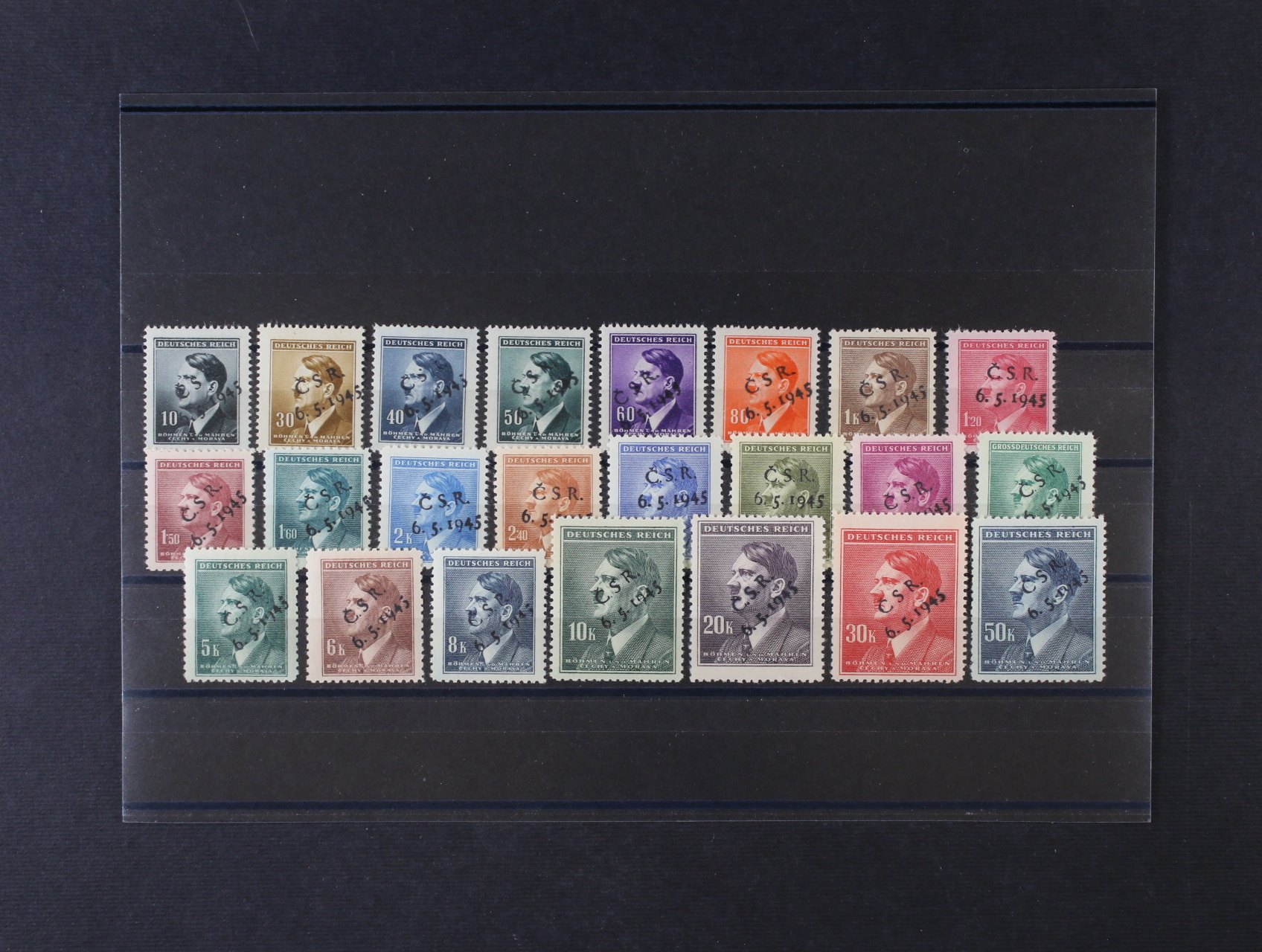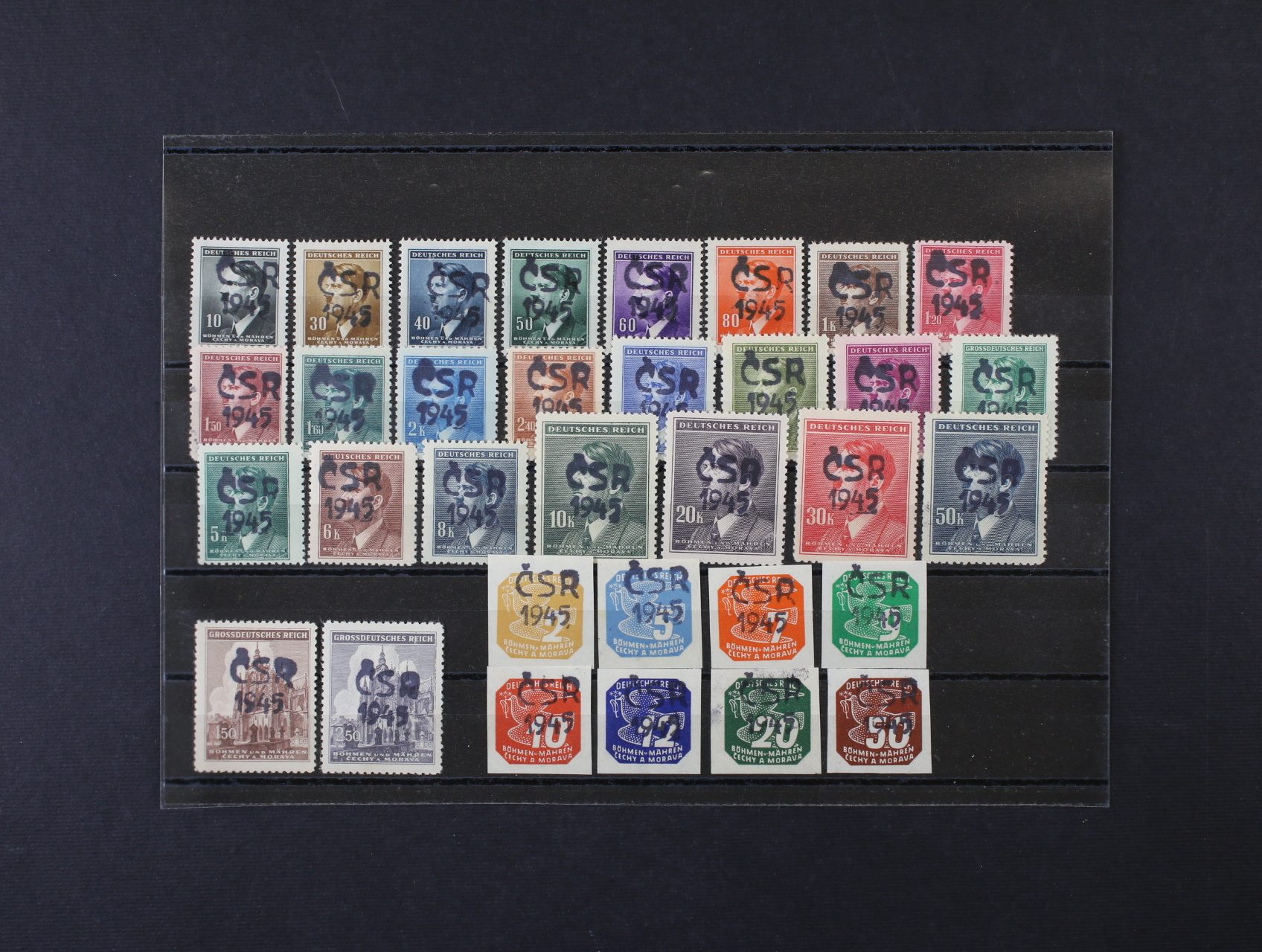 Říčany u Prahy - sestava výstřižků s 17ks protektor. zn. A. H. s přetiskem ČESKOSLOVENSKO PRAVDA VÍTĚZÍ, raz. 9. V. 45