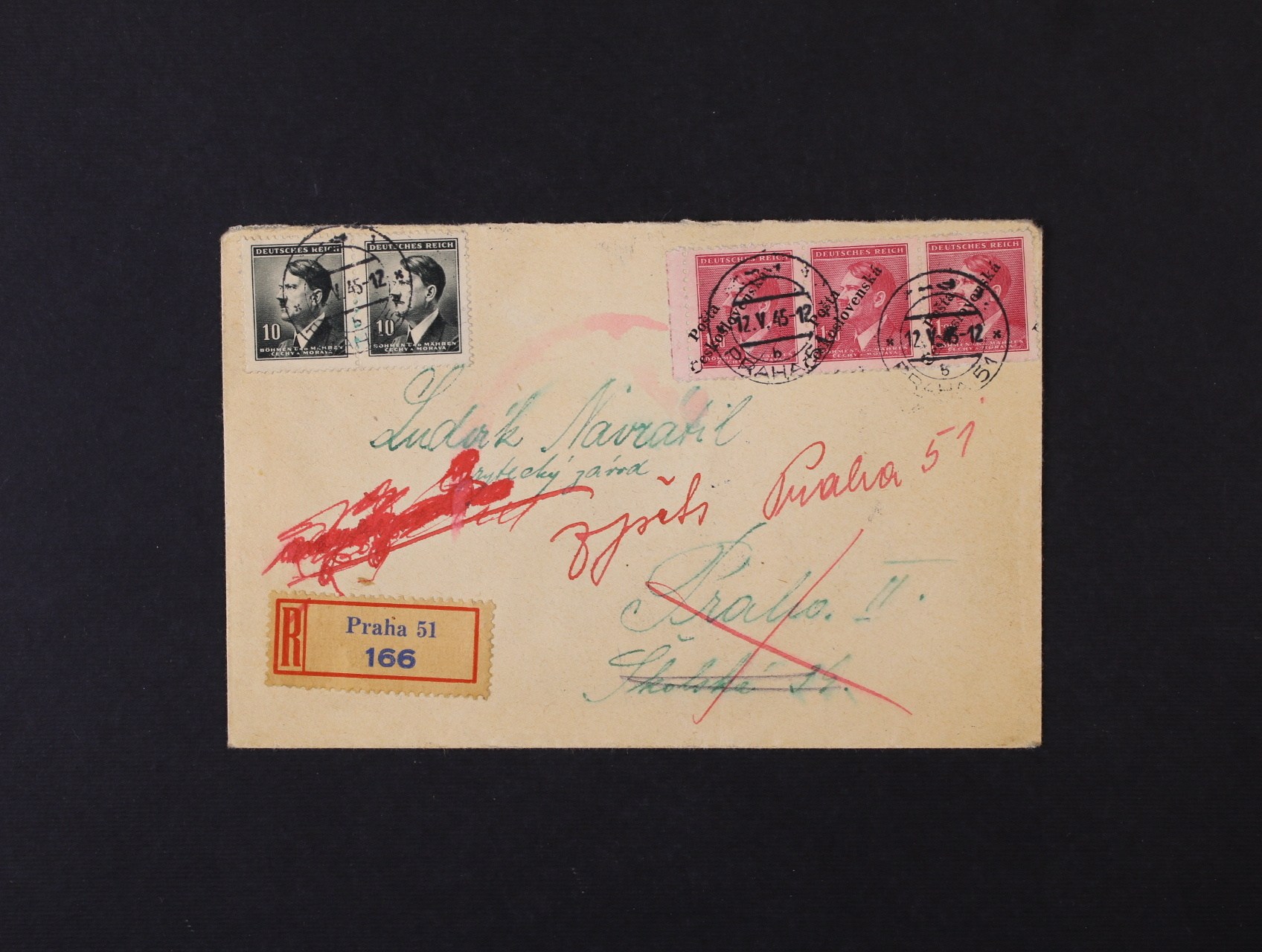 Praha - R-dopis v místě vyfrank. 2ks protektor. zn. A.H. a 3ks protektor zn. A.H. s přetiskem Pošta Československá, pod. raz. 12.V.45 PRAHA 51, příchozí raz. 14. V.45 PRAHA 11