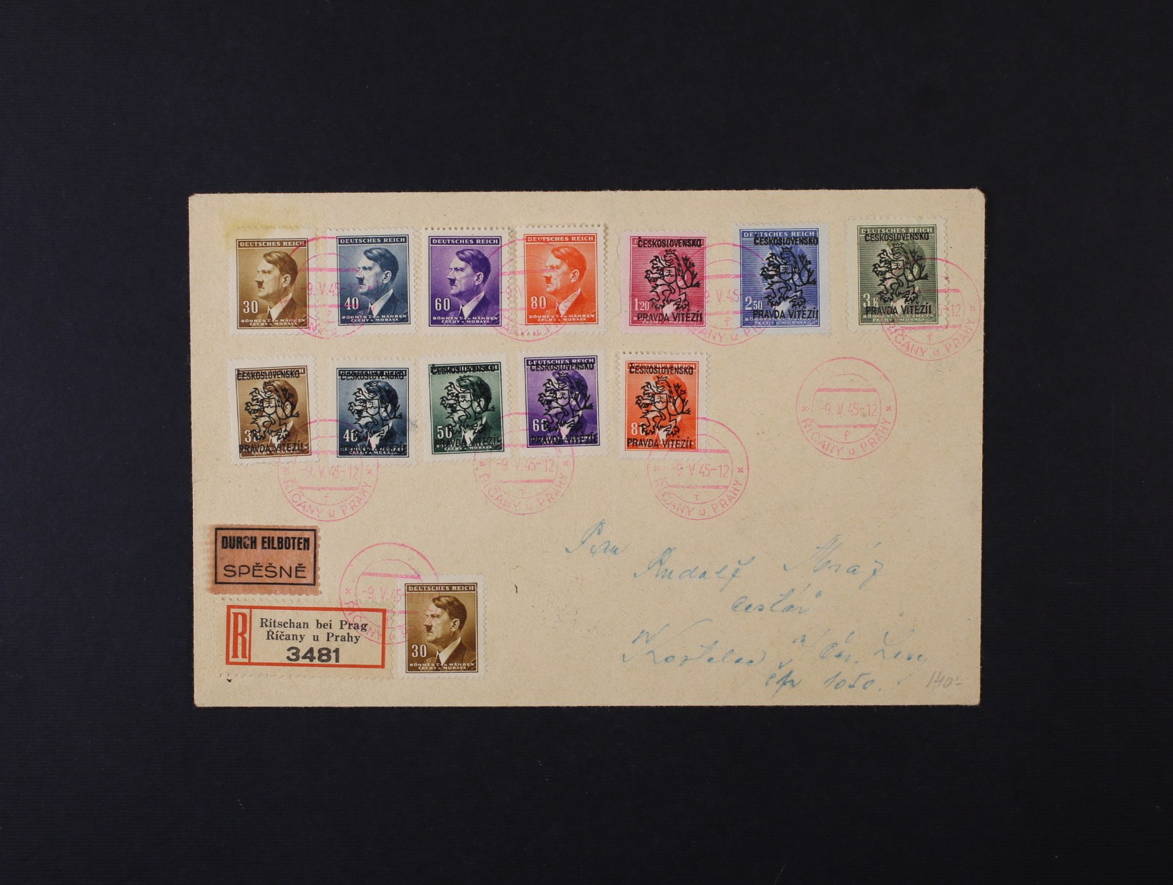 Říčany u Prahy - R-dopis do Kostelce, vyfrank. 5ks protektor. zn. A.H. + 8ks protektor. zn. A.H. s přetiskem ČESKOSLOVENSKO PRAVDA VÍTĚZÍ, červené pod. raz. 9. V. 45, příchozí raz. 16.5.45 KOSTELEC n. ČER. LESY, lehký svislý lom uprostřed