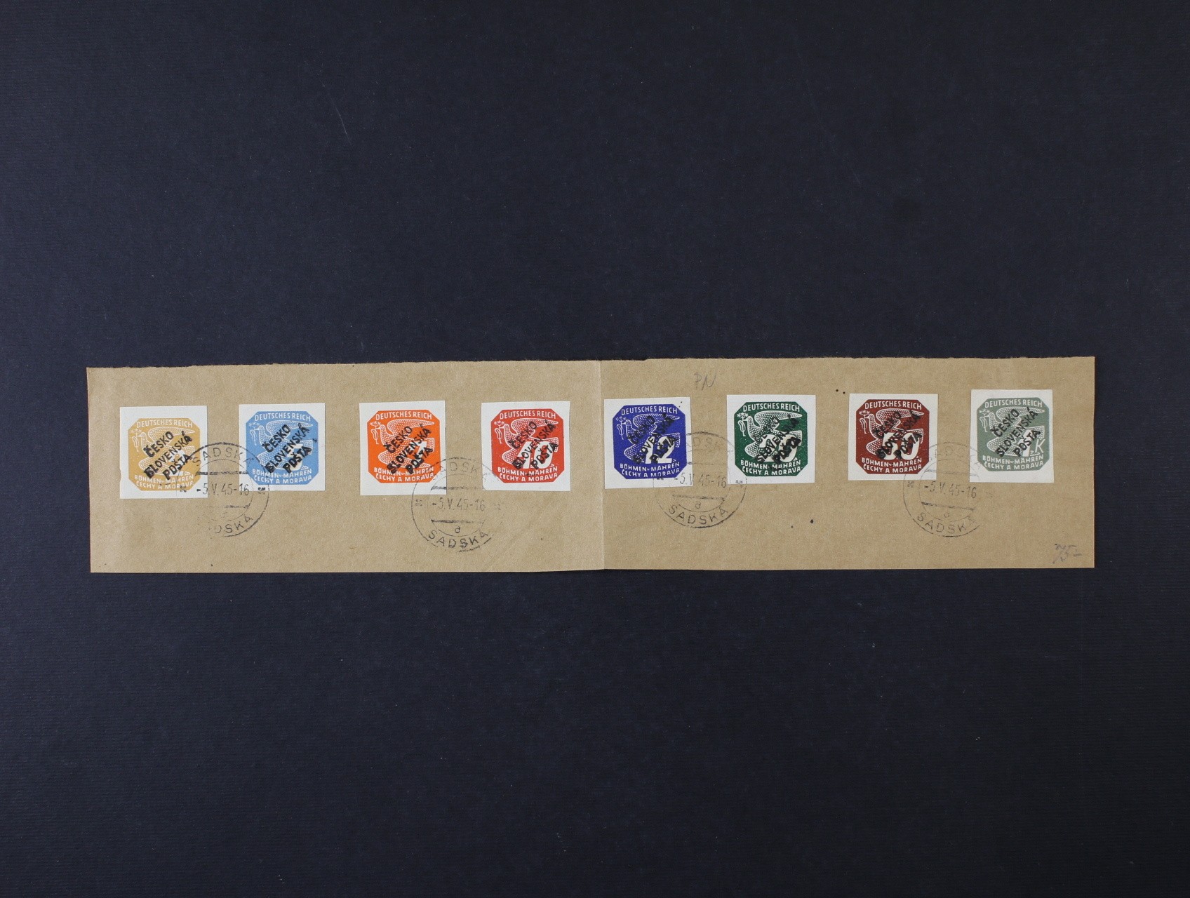 Sadská - výstřižek s 8ks novin. protektor. zn. s přetiskem ČESKO SLOVENSKÁ POŠTA, raz. 5. V. 45