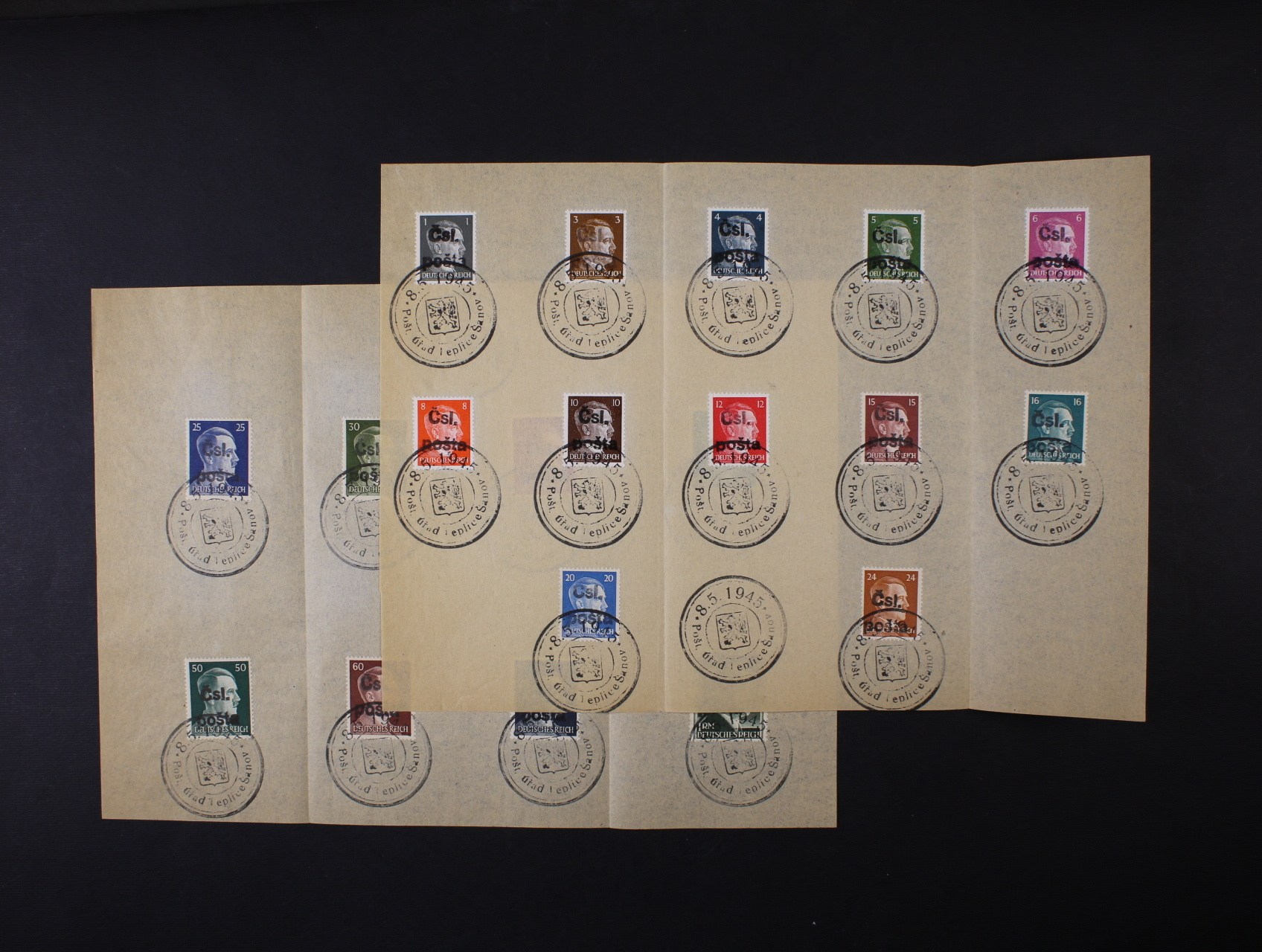 Teplice Šanov - 2 výstřižky s 20ks německých zn. A. H. s přetiskem Čsl. pošta, raz. 8.5.1945, 2x přeloženo svisle mimo zn.