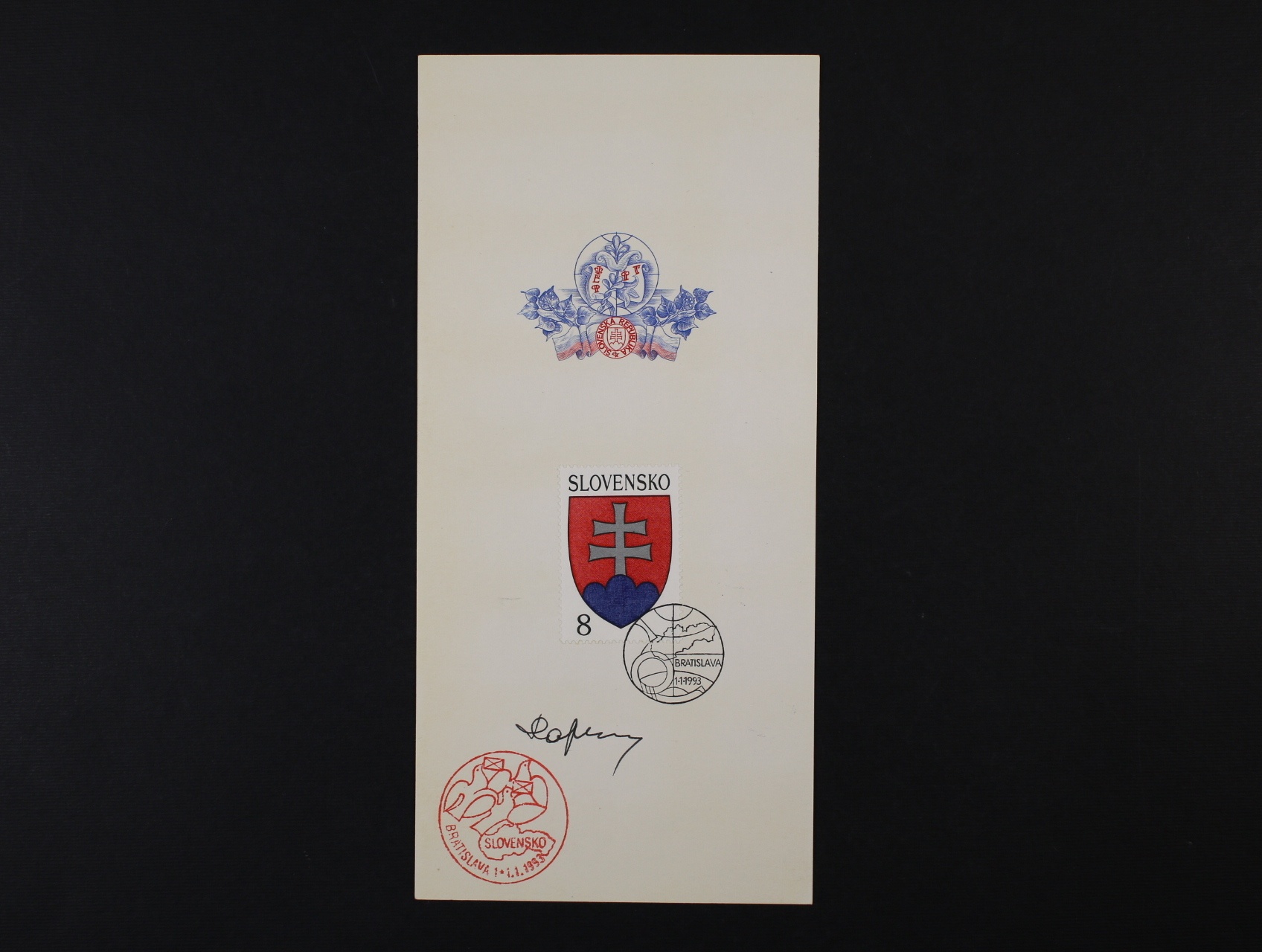 972 pam. list s vylepenou zn. č. 2 s černým a červeným pam. raz. BRATISLAVA 1.1.1993 s vlastnoručním podpisem ministra dopravy a spojů SR B. Hofbauer 1800