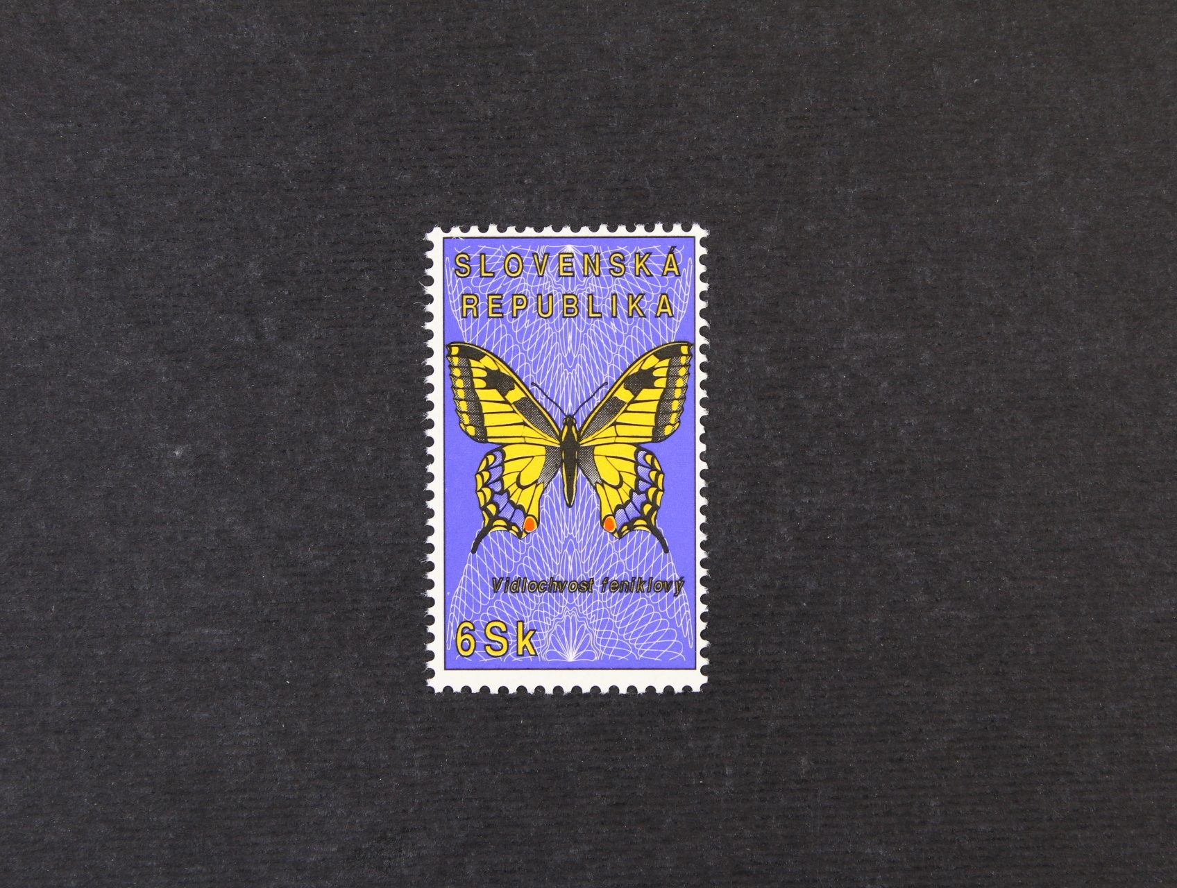 980 otisk nepřijatého návrhu na zn. 6Sk "motýl" v modro-žluto-černé barvě, vytištěno bylo 2500 ks pro propag. účely, část byla rozdána na výstavě PRINTING BRATISLAVA 1993, zbytek skartován 1000