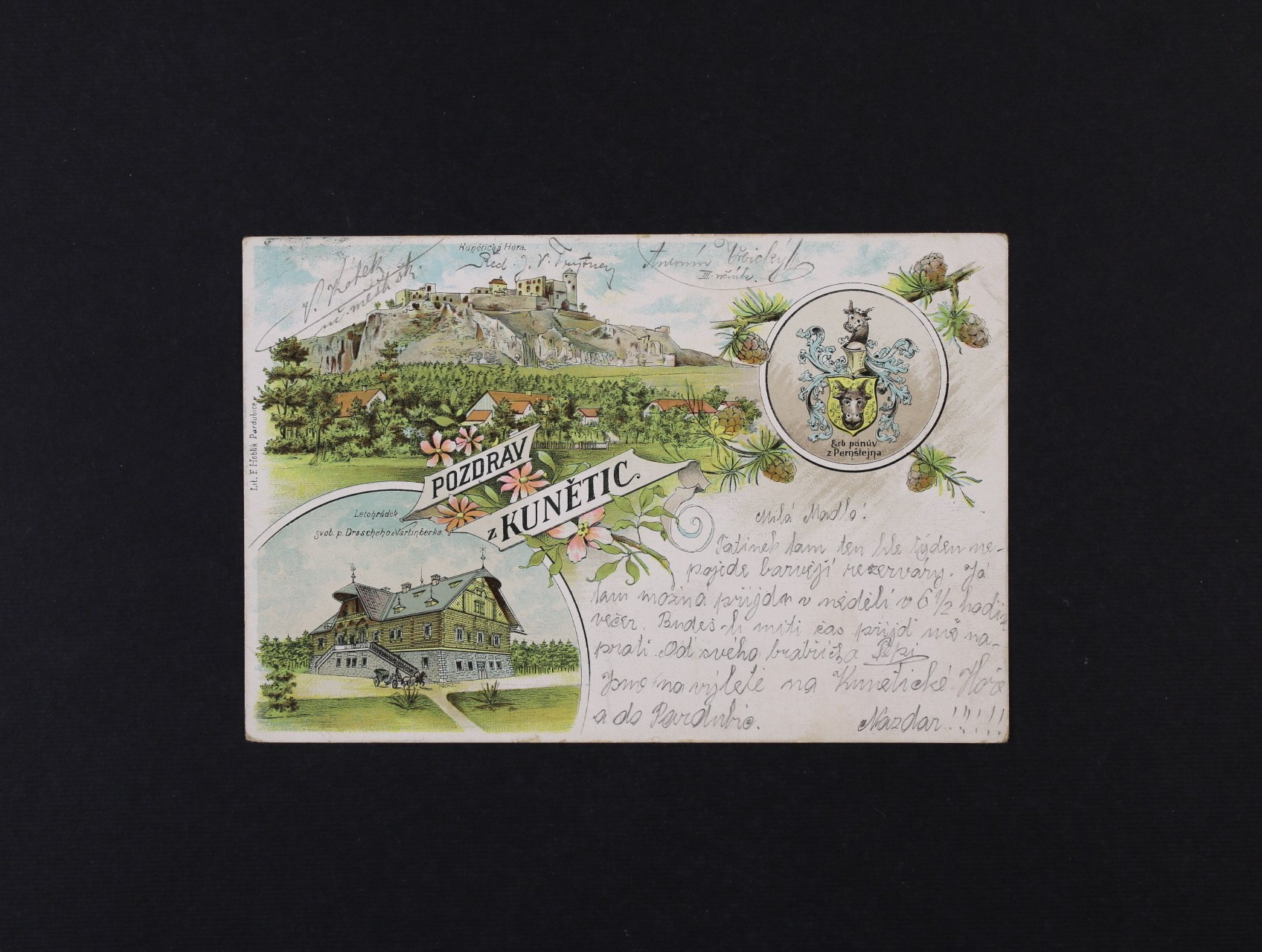 1000 Kunětice, okr. Pardubice - bar. litogrtaf. koláž, dl. adresa, použitá 1905 260