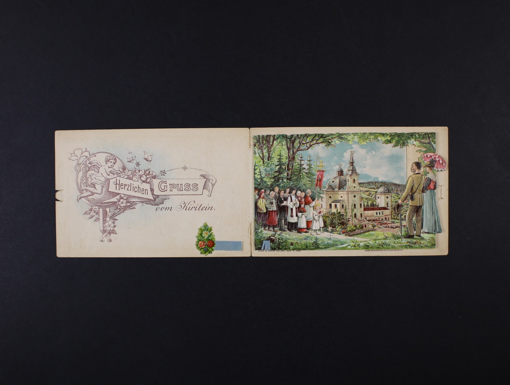 999 Křtiny, okr. Blansko - dvoudílná bar. litografie otvírací s plastickou skládačkou - pohled na poutní kostel, použitá 500