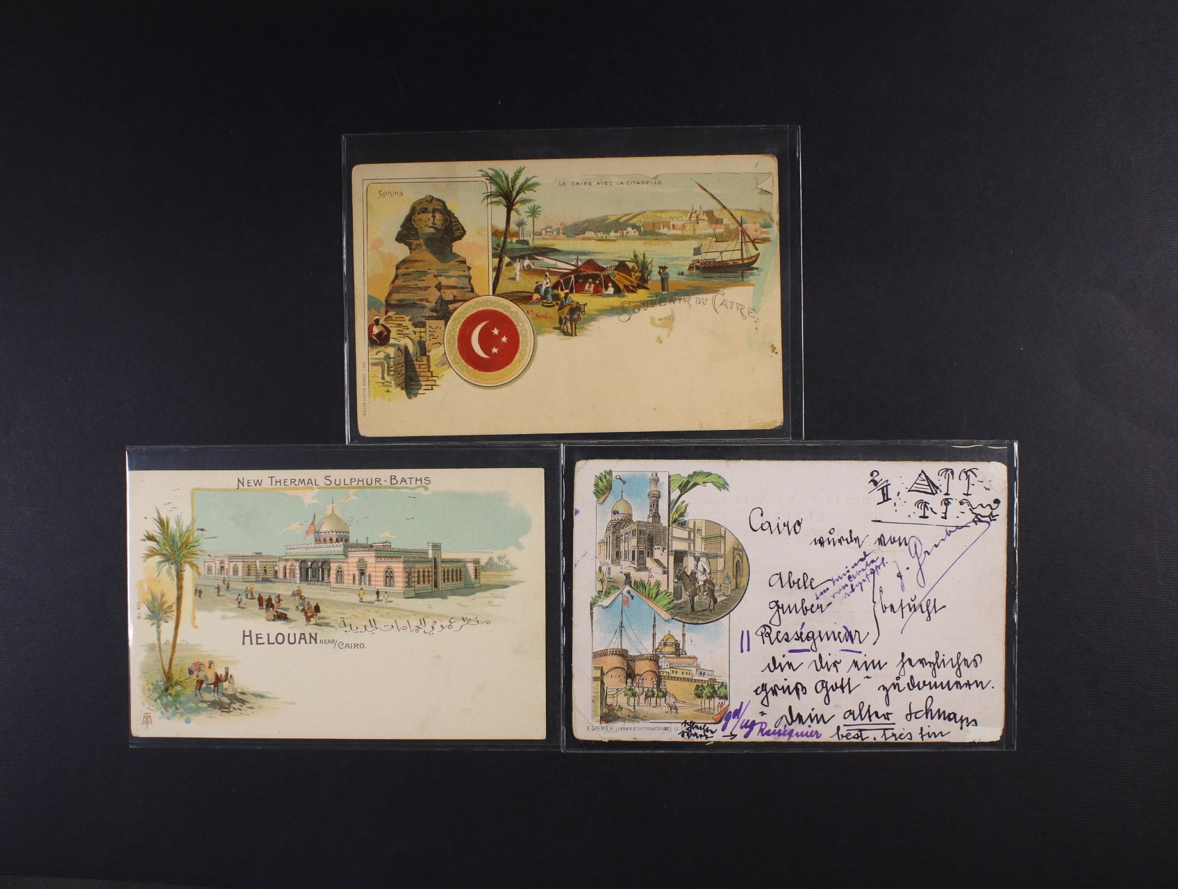 Egypt - sestava 3 ks bar. litograf. koláží, dl. adresy, 1x použitá, 2x nepoužité
