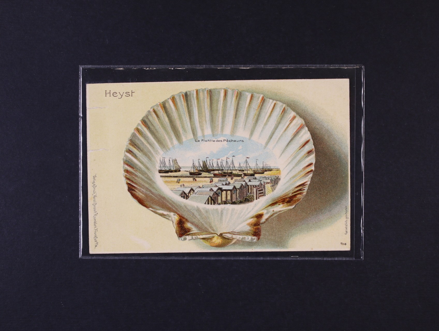 Holandsko - bar. reliéfní litograf. koláž "mušle" Heyst, nepoužitá, na levém okraji na dvou místech natržená