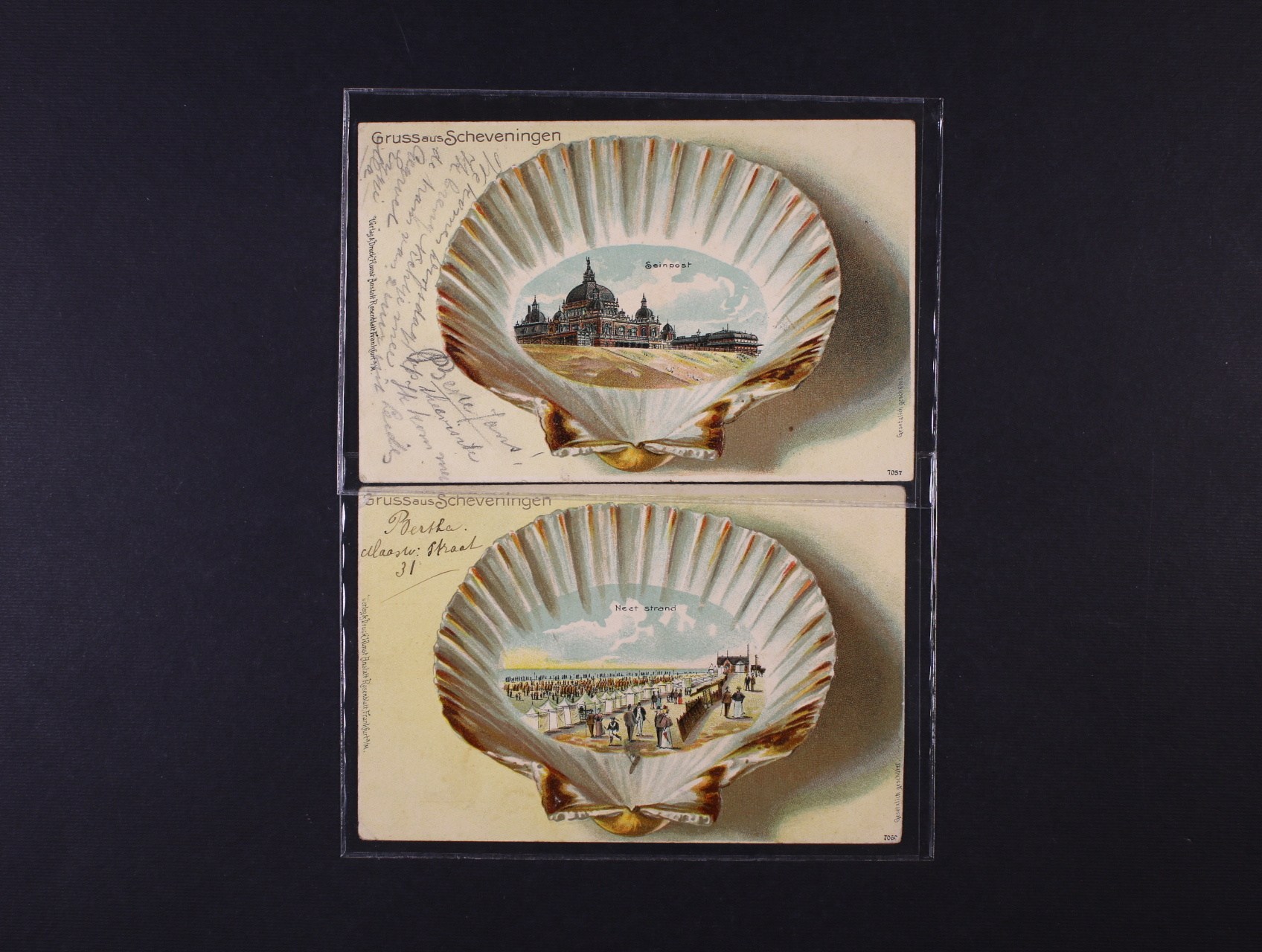 Holandsko - dvě bar. reliéfní litograf. koláže "mušle" Scheveningen, použité