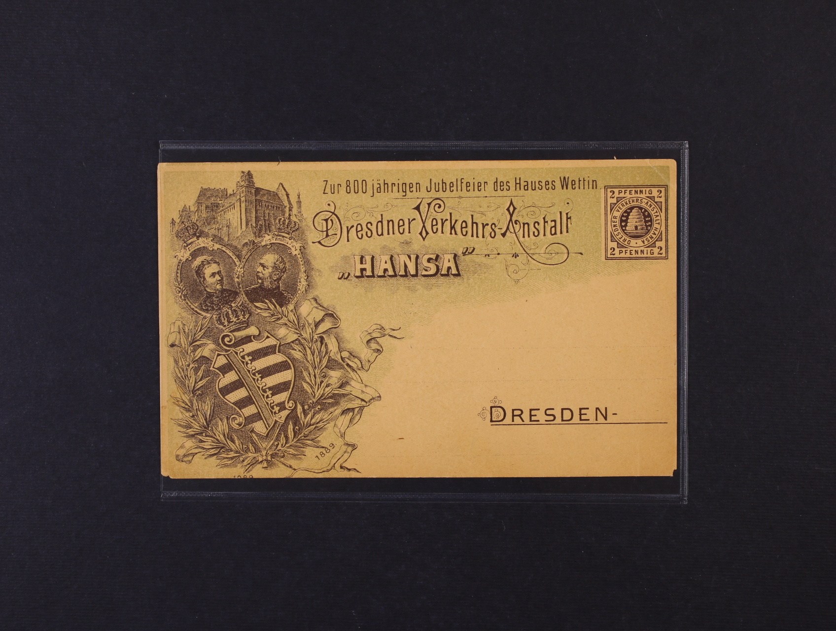 Německo - předběžné - dopisnice městské pošty Drážďany s obrázkem císař. páru, vydaná r. 1889, nepoužitá, v pravém horním rožku lom