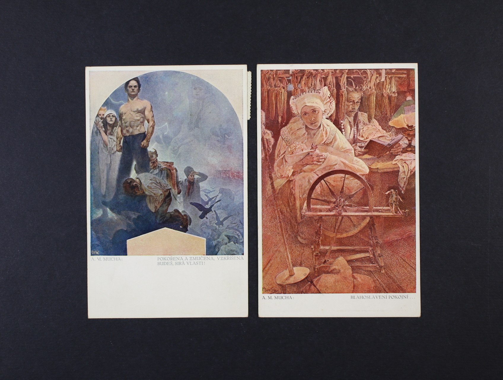 A. Mucha - bar. pohlednice "Pokořena a zmučena, ...", použitá, bar. pohlednice "Blahoslavení pokojní ...", nepoužitá