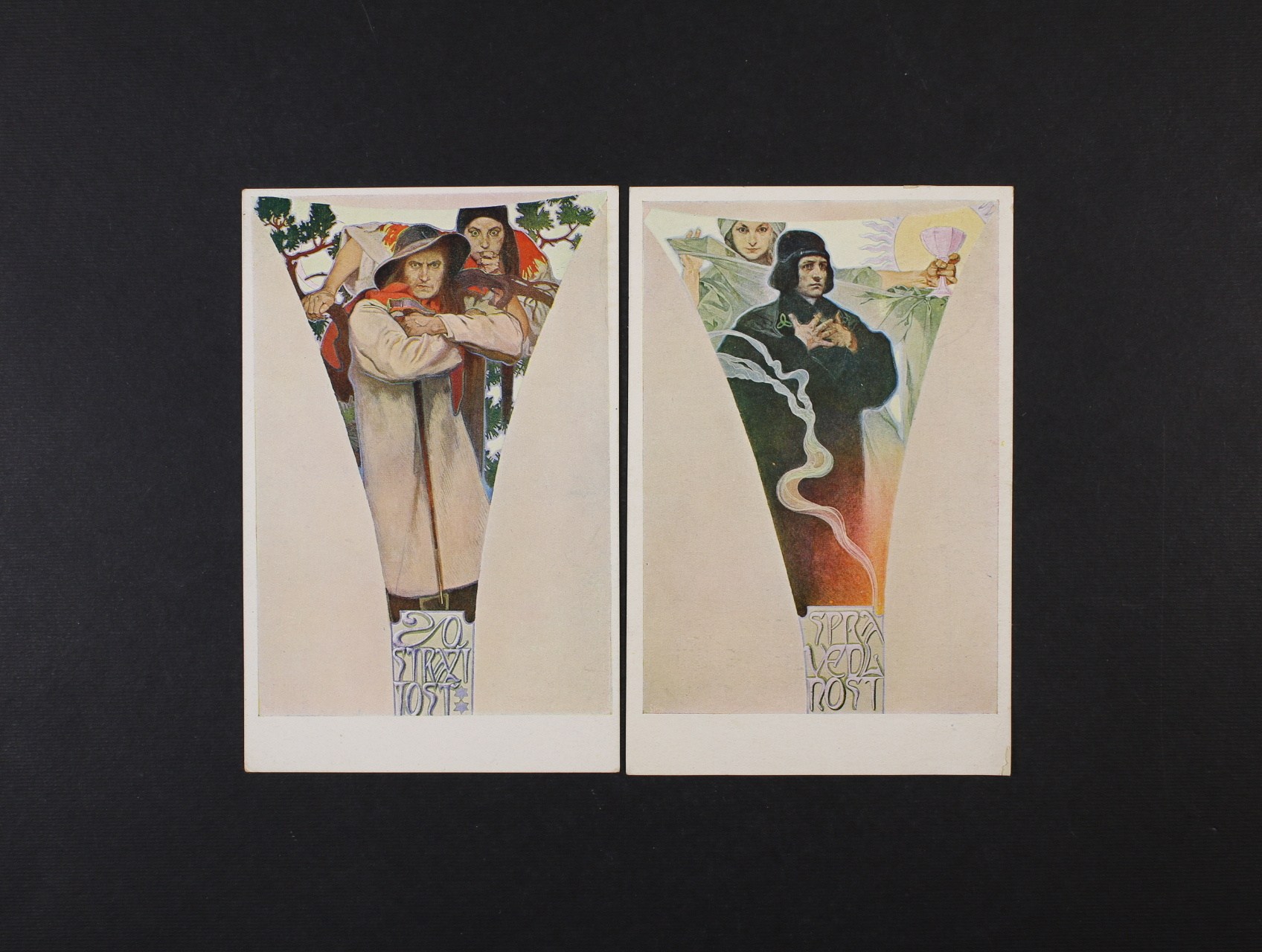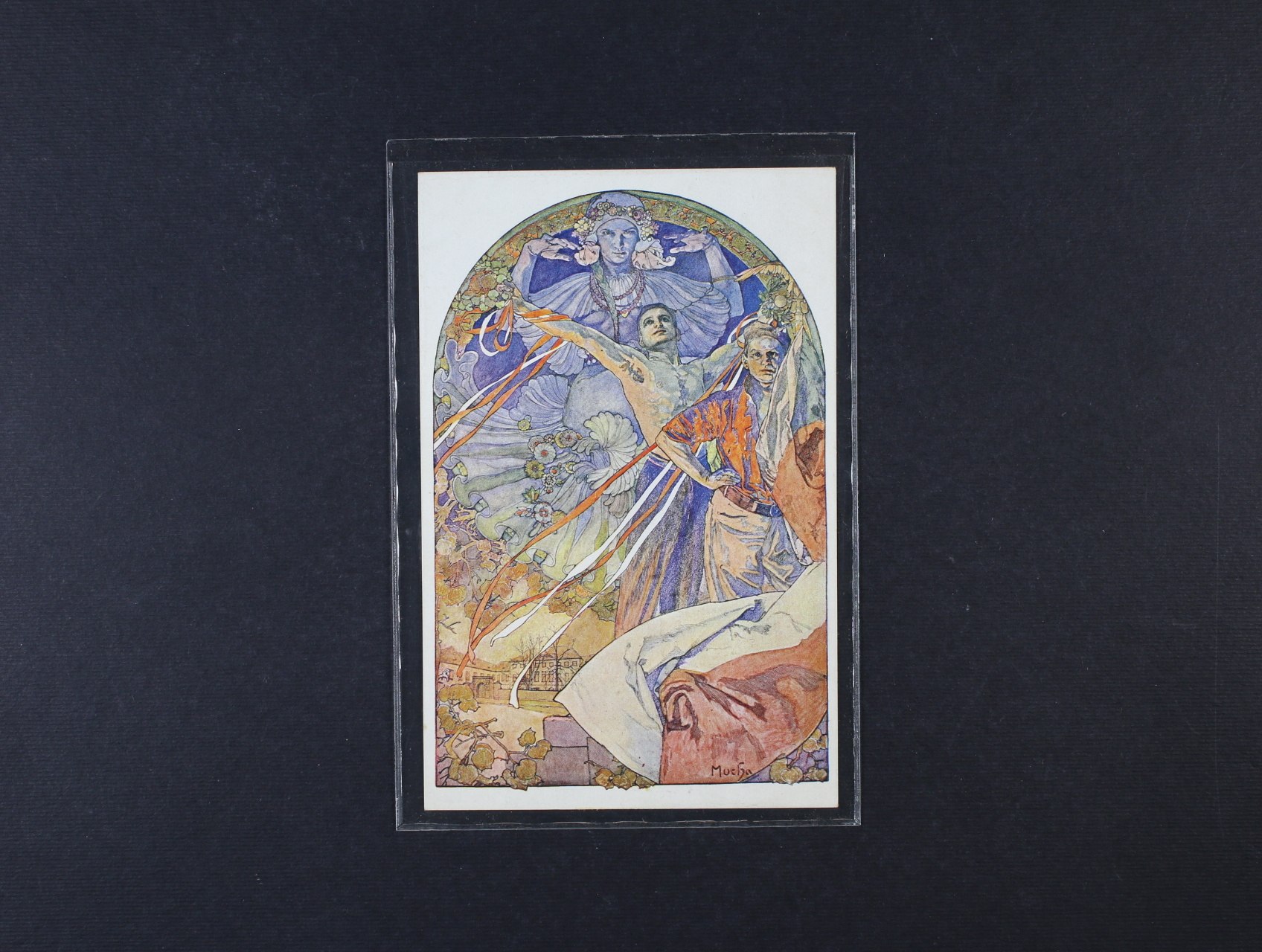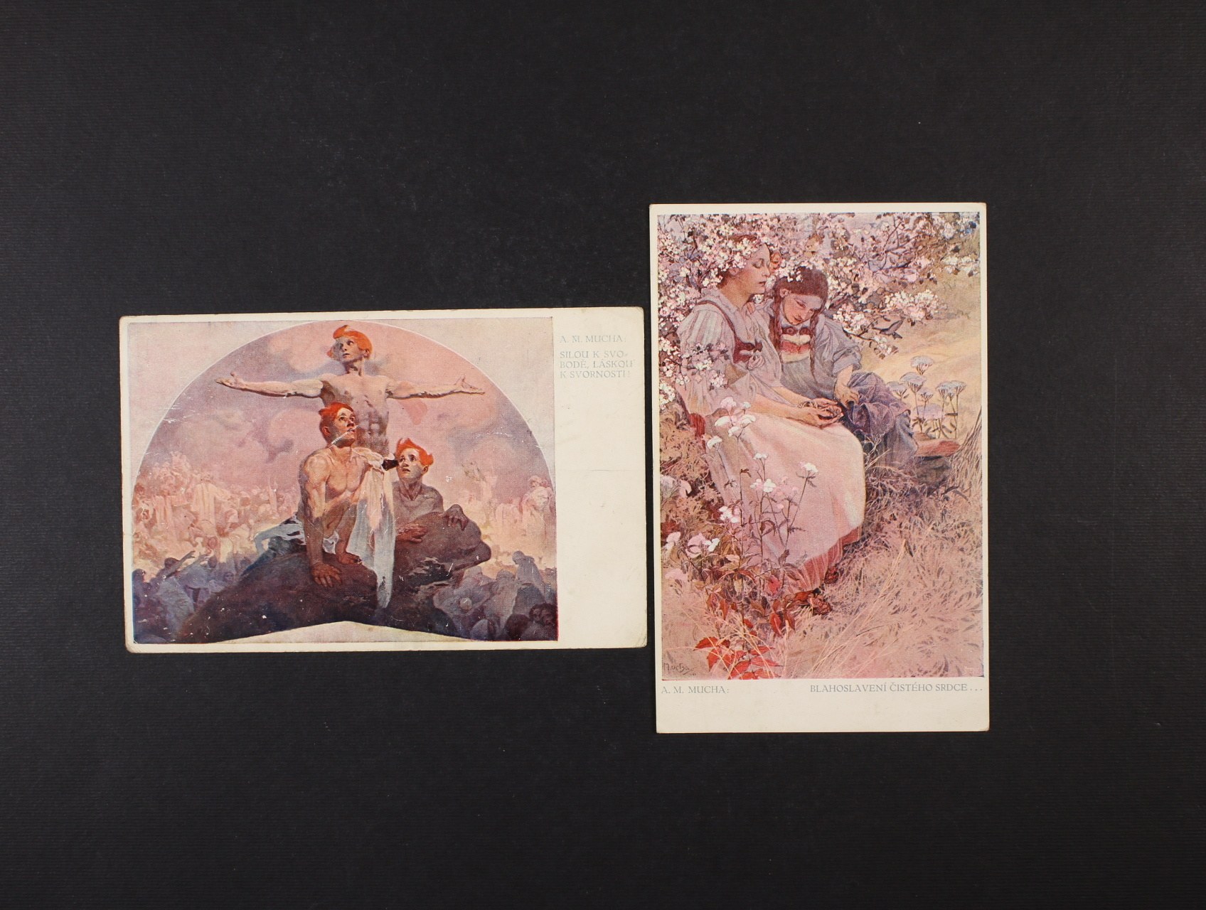 A. Mucha - bar. pohlednice SIlou k svobodě ... a dtto Blahoslavení čistého srdce, použité