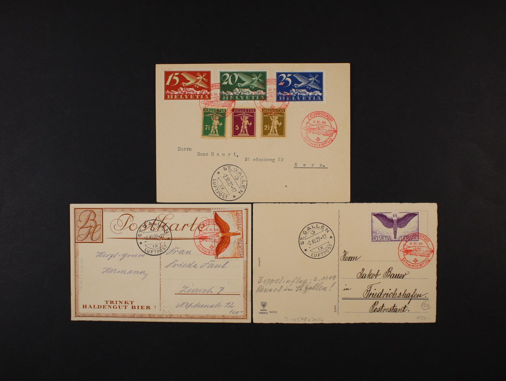 Švýcarsko - 3 celistvosti, FAHRT NACH ZURICH, Sie.46, 3 celistvosti s let. známkami Švýcarska, raz. ZEPPELIN POST / SCHEIZERFLUG 2. XI. 29; bezvadný set, mj. vzácná samostatná 75C Mi. č.190x