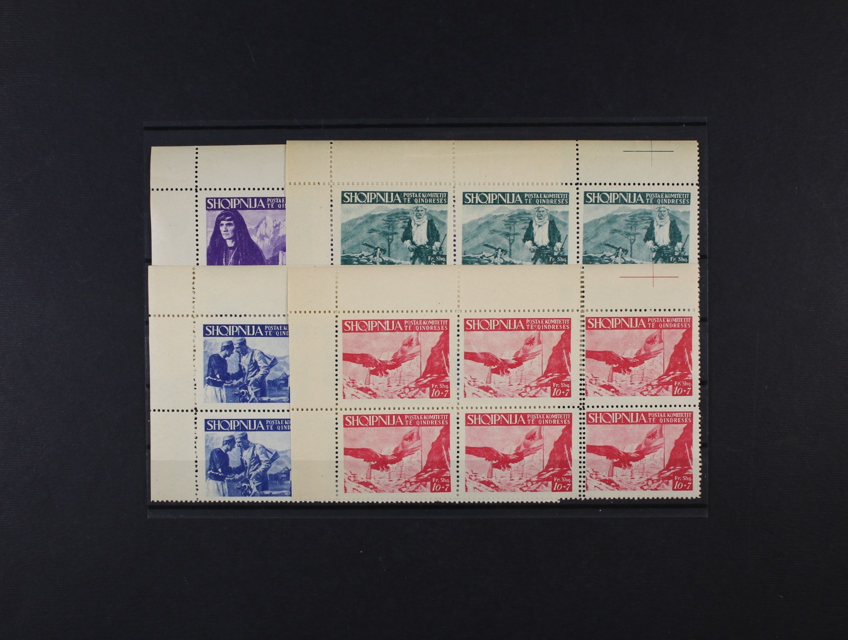 Exilové vydání “National Committee for a Free Albania (NCFA)” v Londýně, tzv. 1. emise protikomunistického odboje (vznik roku 1944 nebo 1945), kompletní série POSTA E KOMITETIT TE QUINDRESES (Pošta odbojového výboru) 2-10Fr, v rohových 6-blocích; velmi malý náklad