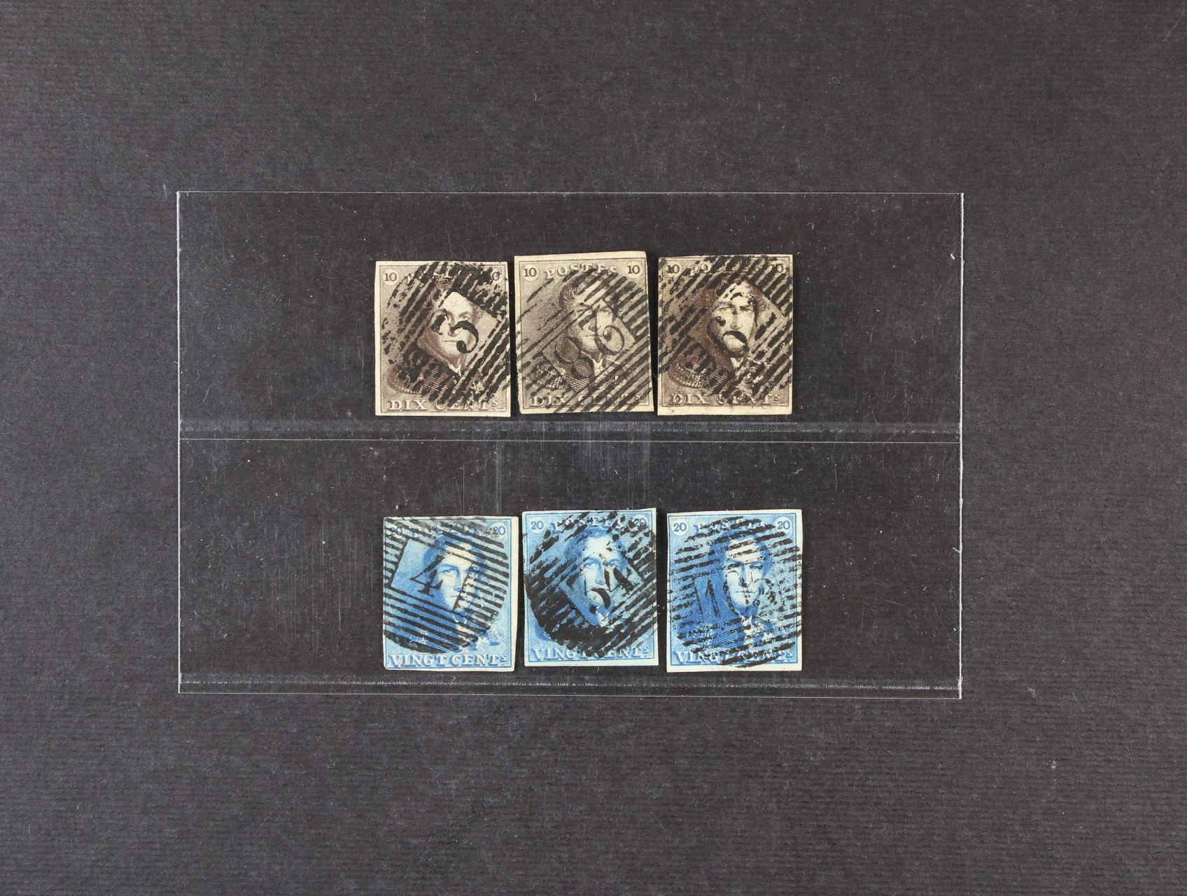 1849 zn. Mi. č. 1+2; sestava 6ks "Epaulettes" 10C a 20C s vybranými číselnými razítky 3, 4, 28, 34, 62, 105; mimořádná kvalita
