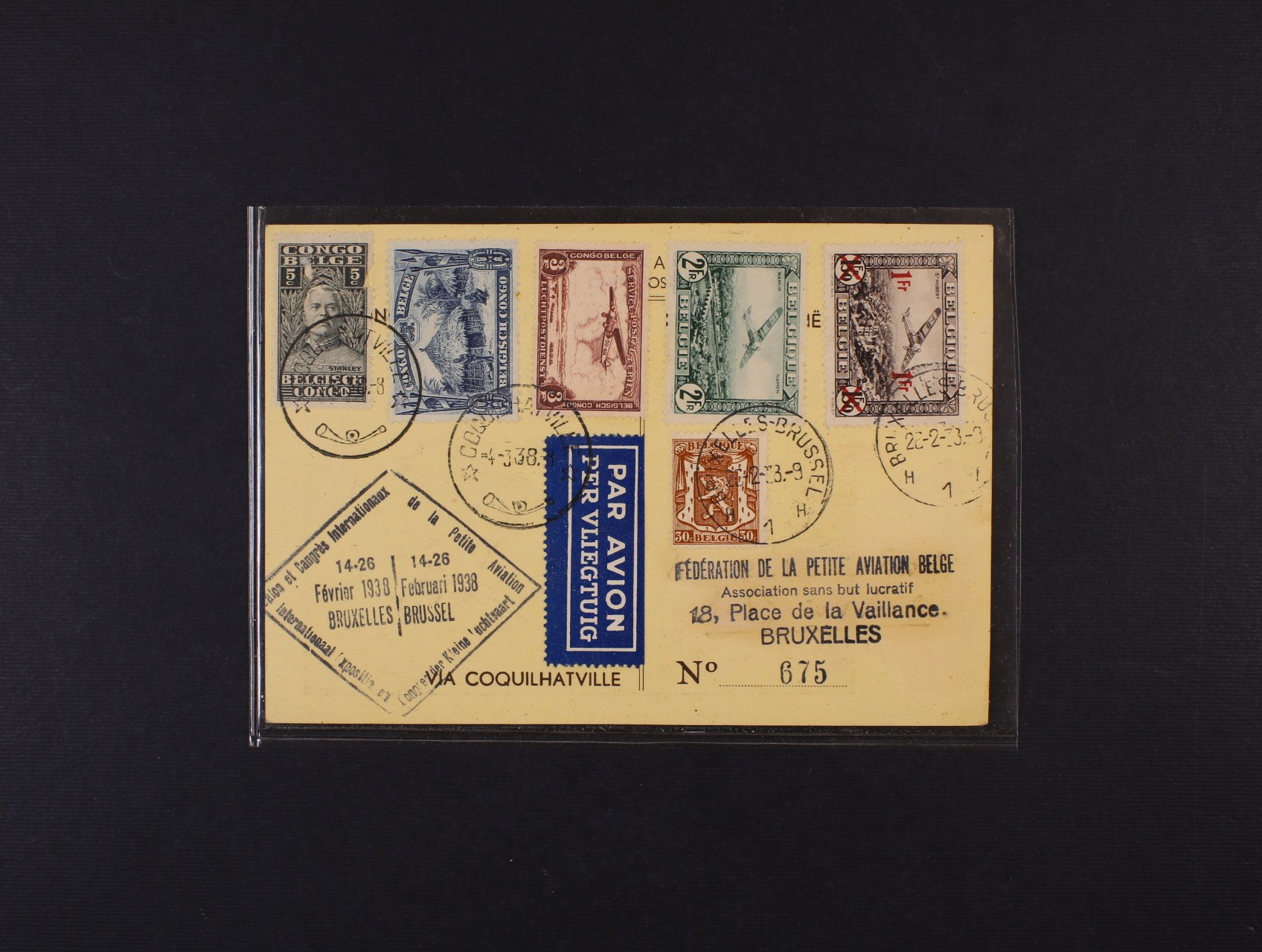 celistvost přepr. výstavním letem do Belgického Conga frank. zn. Mi. č. 282, 399, 420, pod. raz. BRUSSEL 26.2.38, v COQUILHATVILLE dofr. známkami (jedna zn. poškozena) Belg. Conga s razítkem COQUILHATVILLE 4.3.38 + výstavní kašet