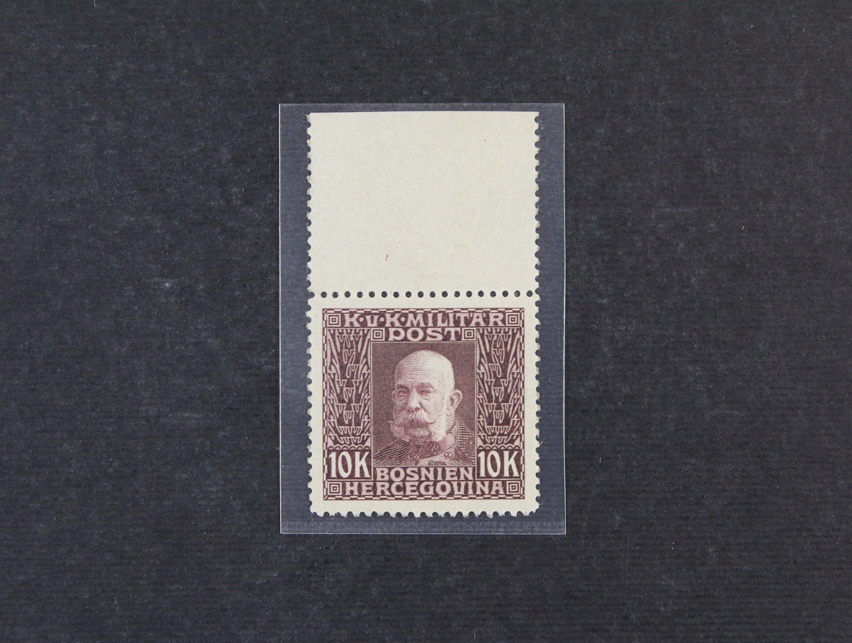 ZT zn. 10K F.J. s horním okrajem v barvě tmavě červenofialové, zoubkování 12 1/2, orig. lep, nálepky, lux. kvalita, velmi vzácný ZT