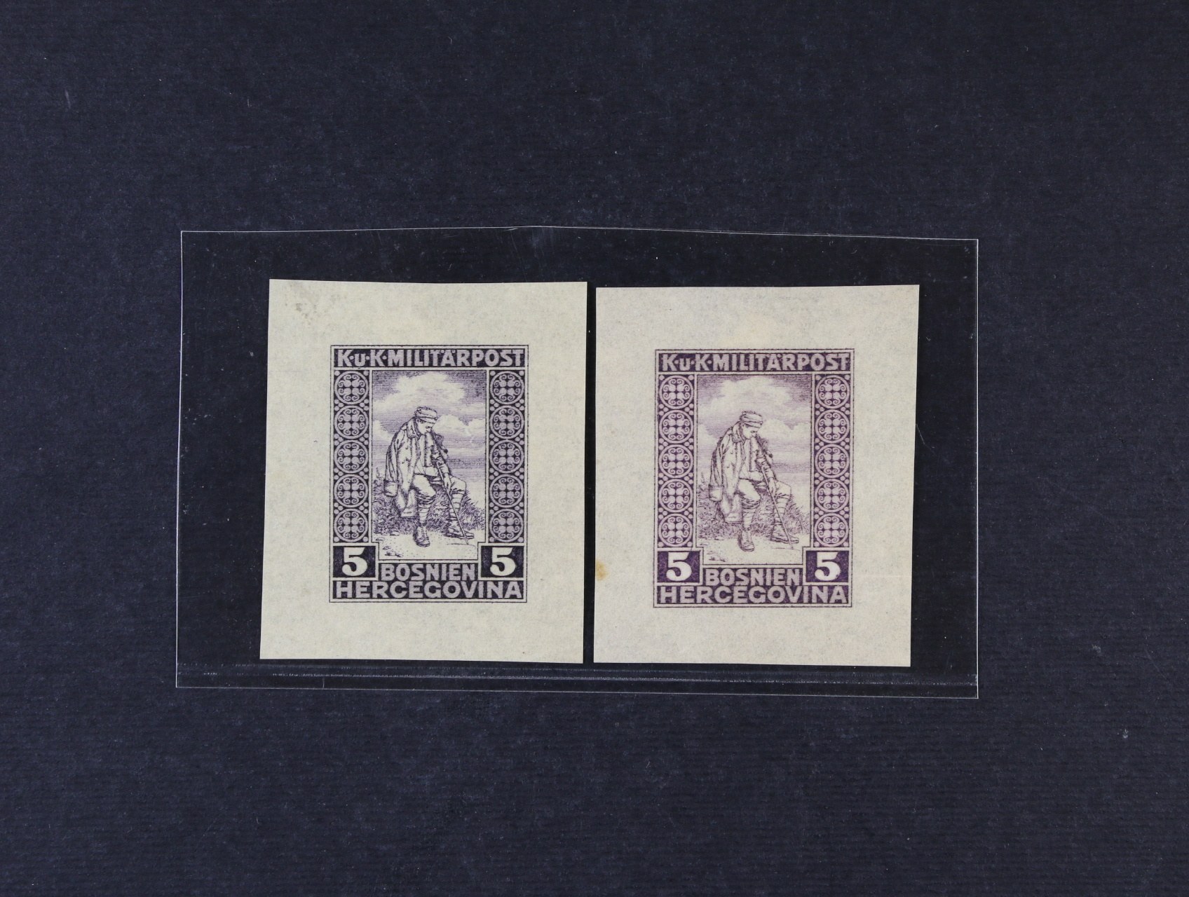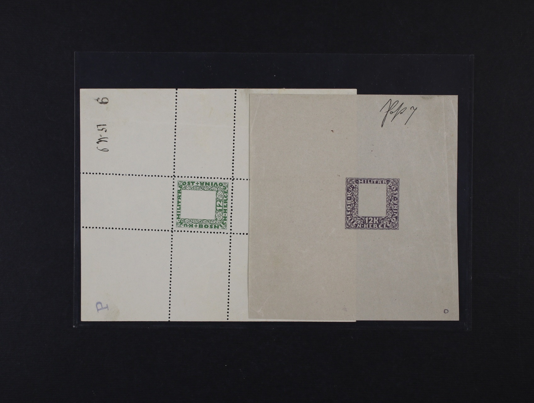 2 ks ZT zn. ANK. č.103, nepřijatého návrhu známky FJ I. 12h - rám v zelené barvě v aršíkové formě s perforací 12 a totéž přijatý essay nezoubkovaný pro NEVYDANOU HODNOTU 12K ve fialové barvě; bezvadné a velmi vzácné, viz Ferch. IV str. 285
